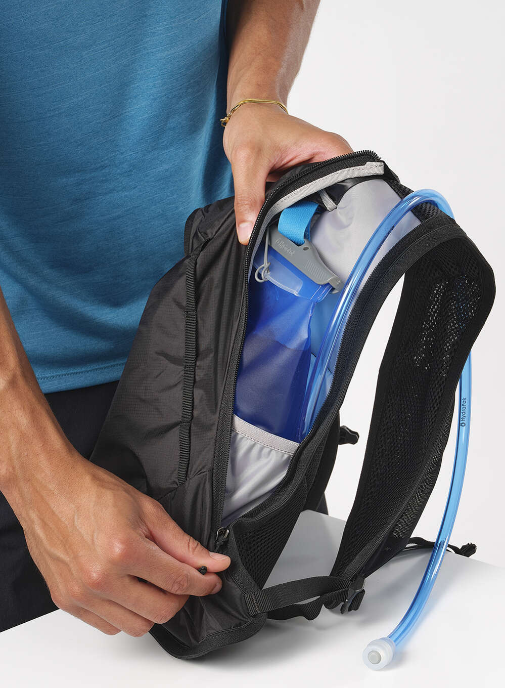 Jego lekka, ergonomiczna konstrukcja dobrze przylega do ciała, jest wygodna i stabilna podczas każdego ruchu. Paski naramienne z kieszeniami, każda na miękki bidon 500 ml (brak w zestawie), a wewnętrzna komora mieści 1,5-litrowy bukłak na wodę.