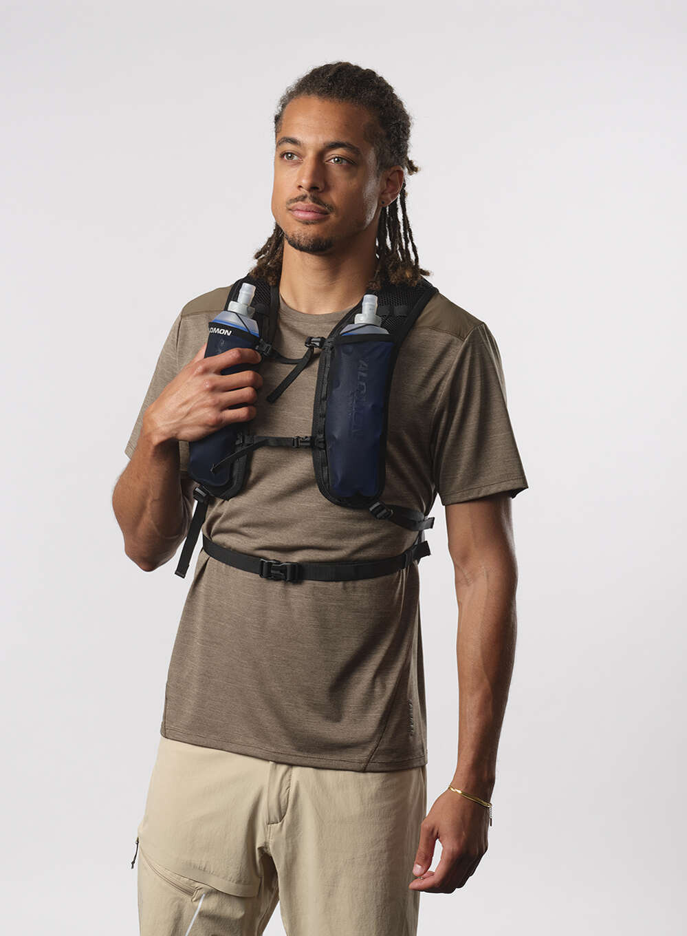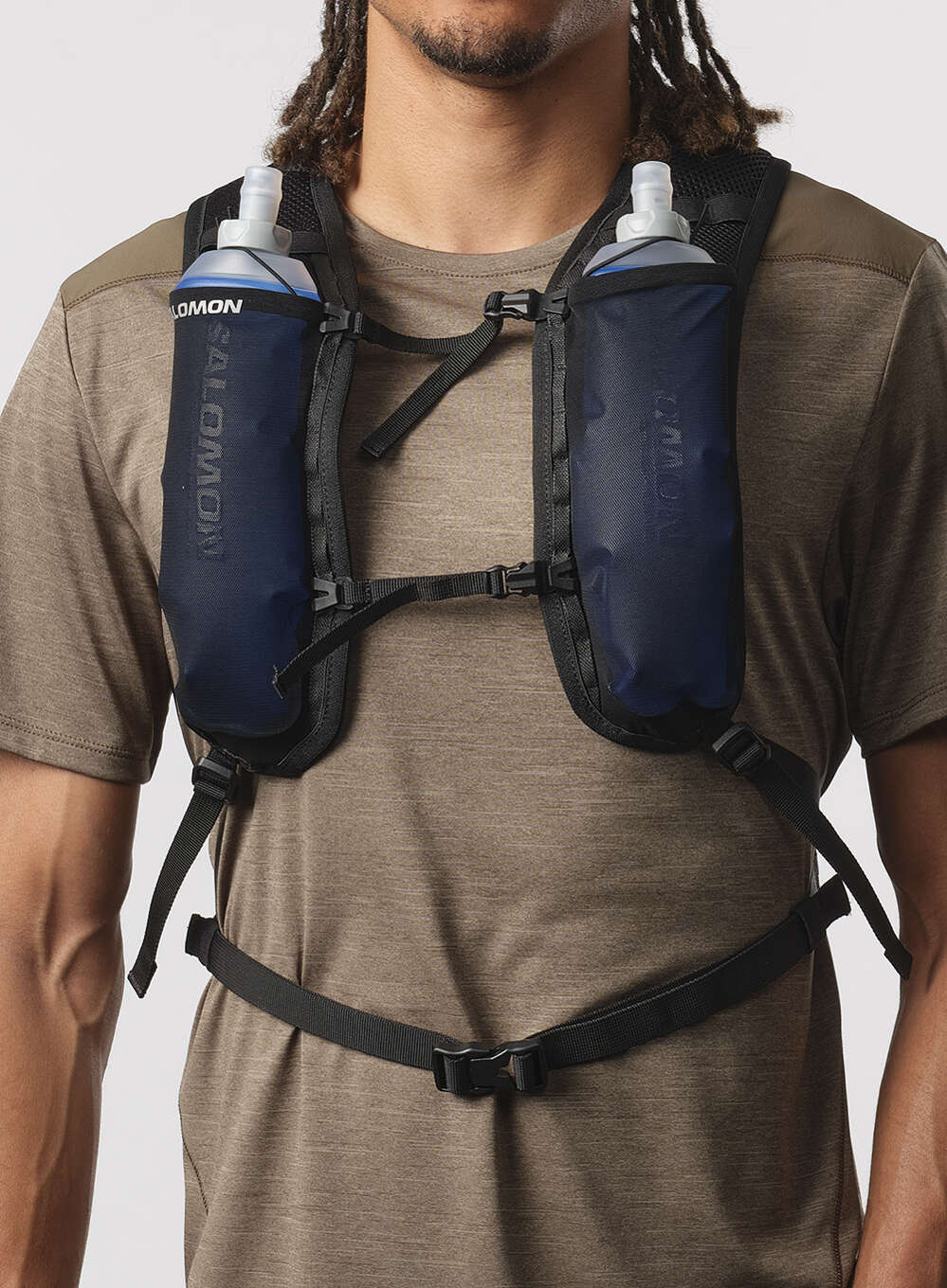• Dwie przednie kieszenie na piersi: zaprojektowane tak, aby pasowały do ​​miękkich bidonów Salomon, przednie kieszenie ograniczają podskakiwanie.
