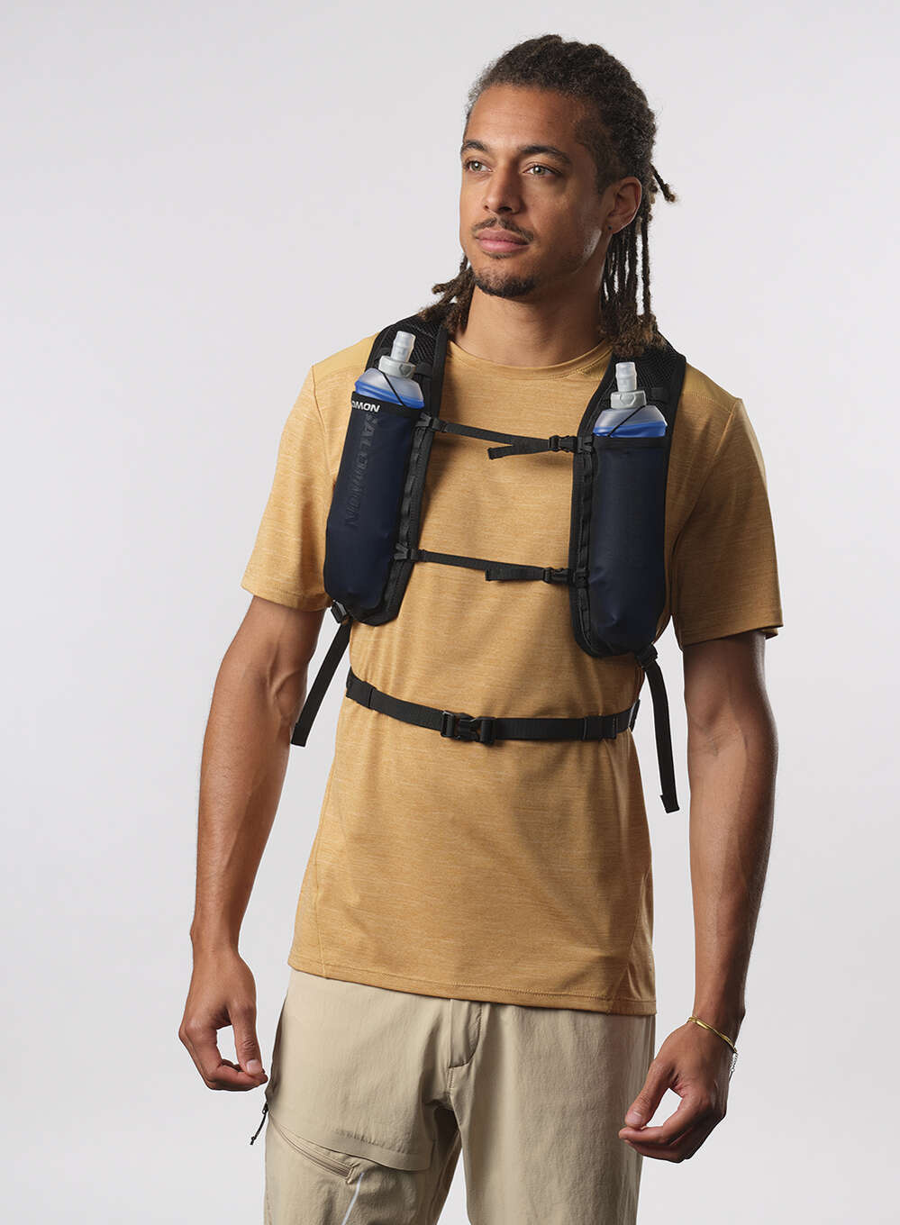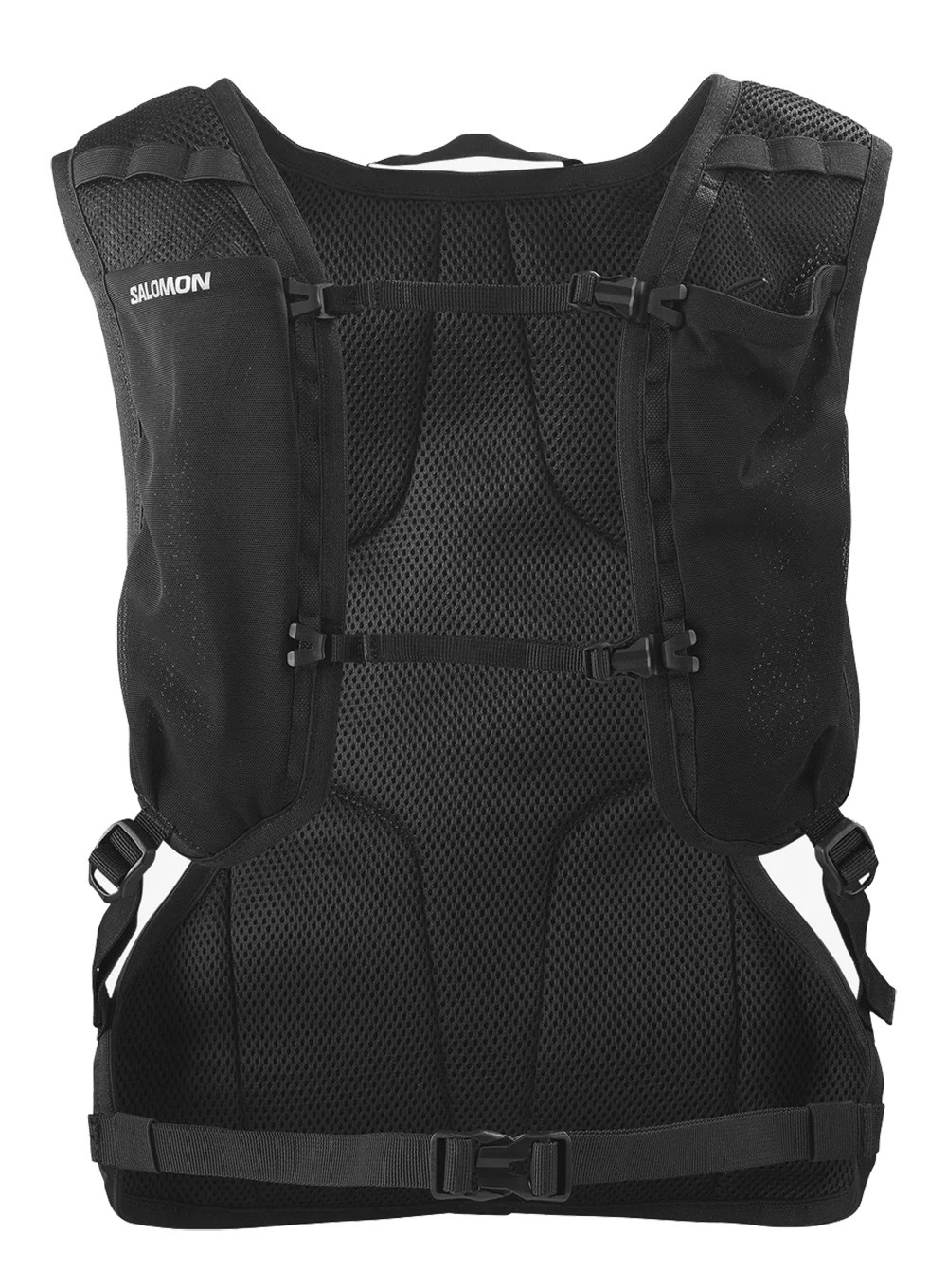 • Dwie przednie kieszenie na piersi: zaprojektowane tak, aby pasowały do ​​miękkich bidonów Salomon, przednie kieszenie ograniczają podskakiwanie.
