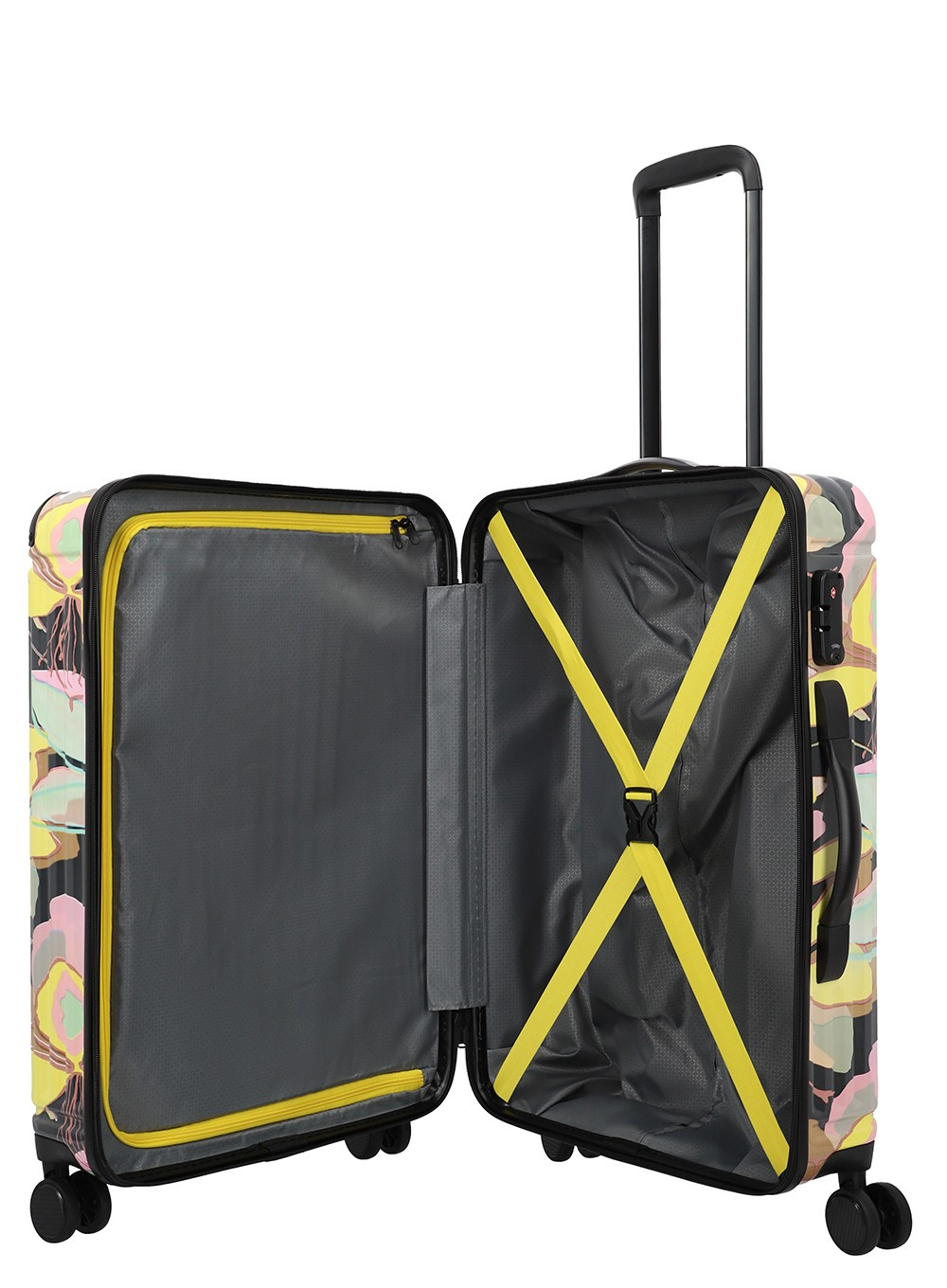 Walizka średniej wielkości Travelite Cruise Trolley M Print wykonana z wytrzymałego polipropylenu. Posiada możliwość poszerzenia pojemności.