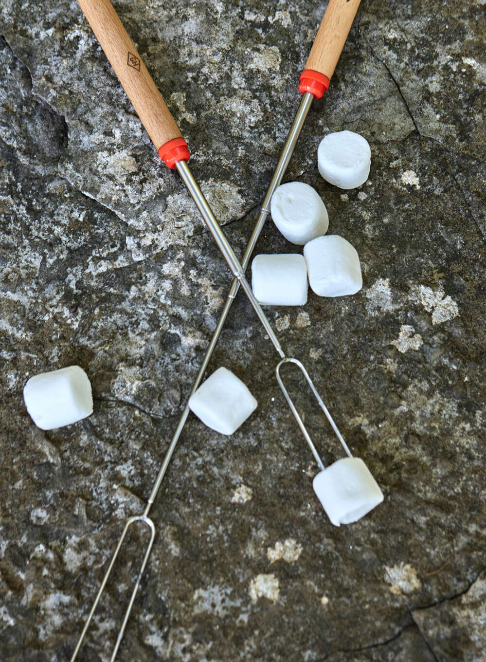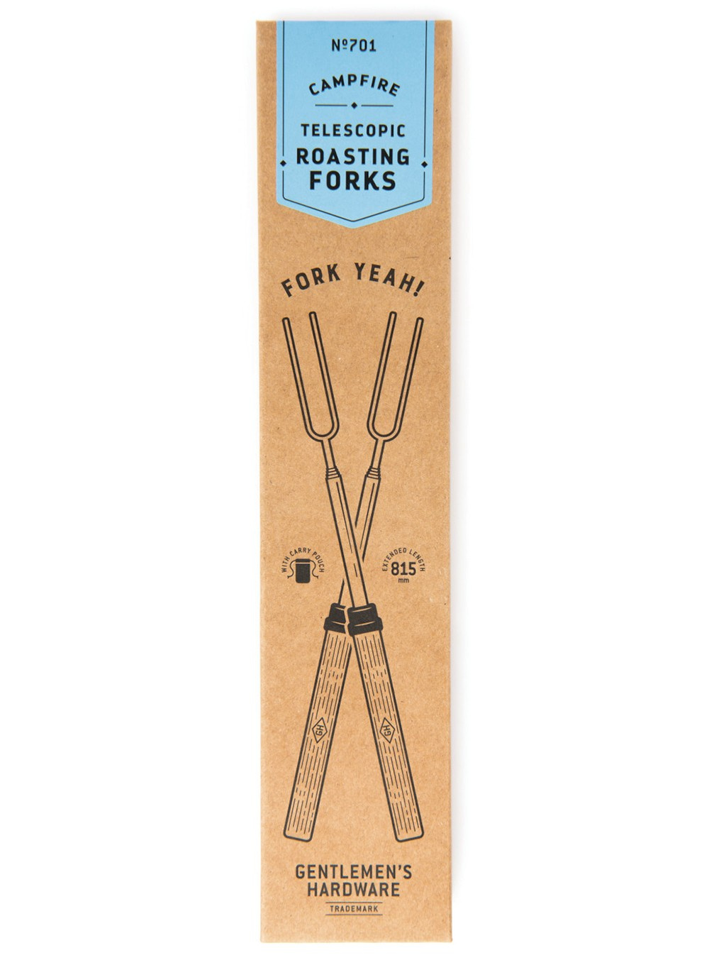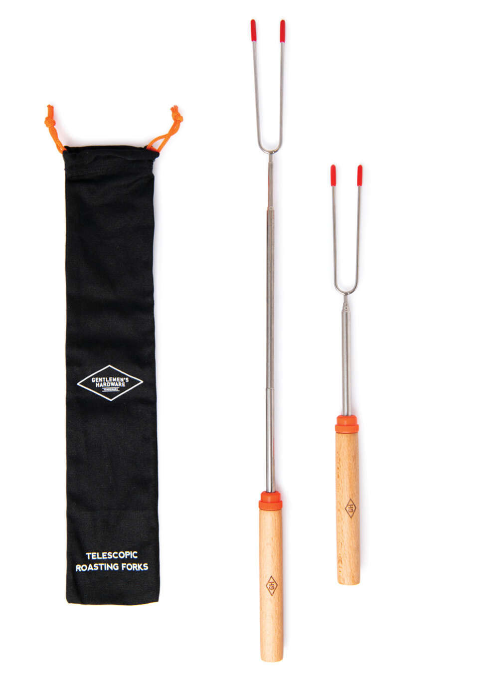 Idealne do pieczenia przy ognisku bez poparzenia palców poręczne teleskopowe widelce Gentlemen's Hardware Telescopic Roasting Forks. Widelce do pieczenia wykonane z drewna i stali nierdzewnej mają długość prawie 60 cm, co pozwala bezpiecznie opiekać pianki marshmallow lub kiełbasę. Zestaw zawiera dwa widelce do pieczenia i torbę transportową.