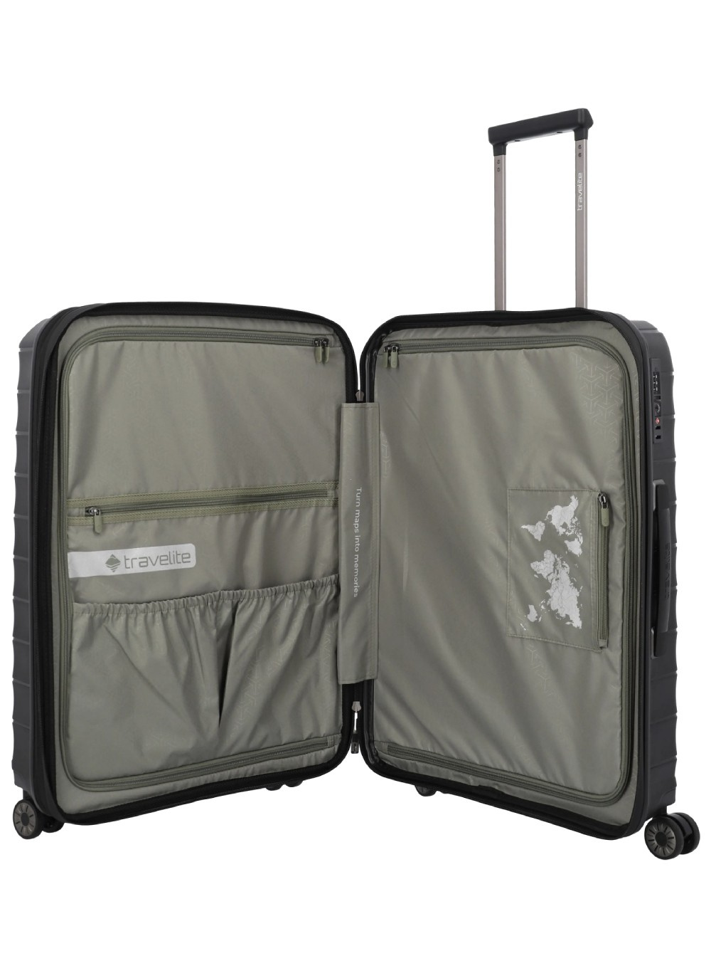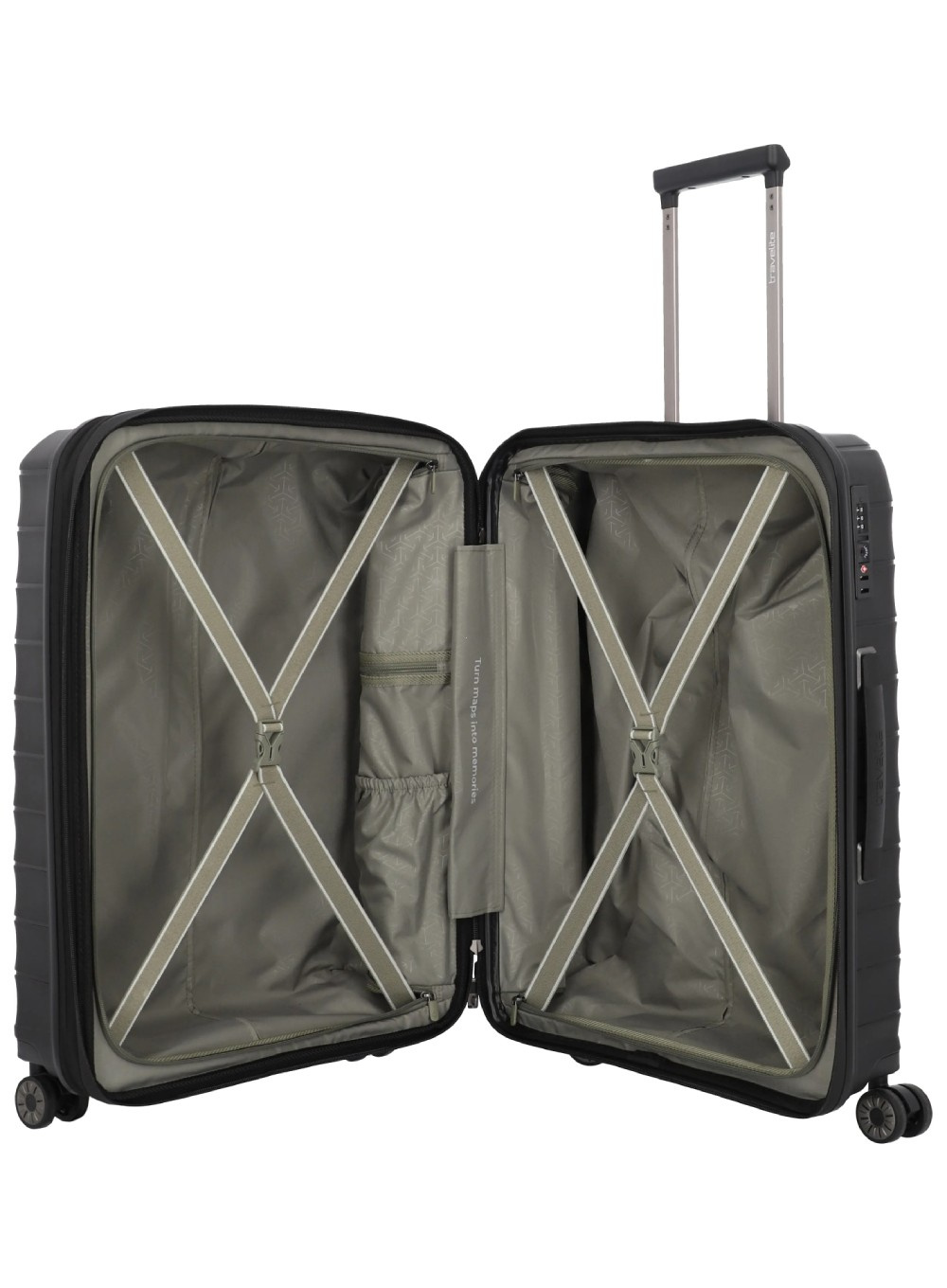 Skorupa walizki średniej Travelite Mooby zawiera dużą część plastiku pochodzącego z recyklingu; podszewka wykonana jest wyłącznie z materiałów pochodzących z recyklingu. Dodatkowe cechy wewnętrzne, takie jak praktyczne paski do mocujące i obie komory z przegrodą zapinaną na zamek, zachwycają funkcjonalnością.