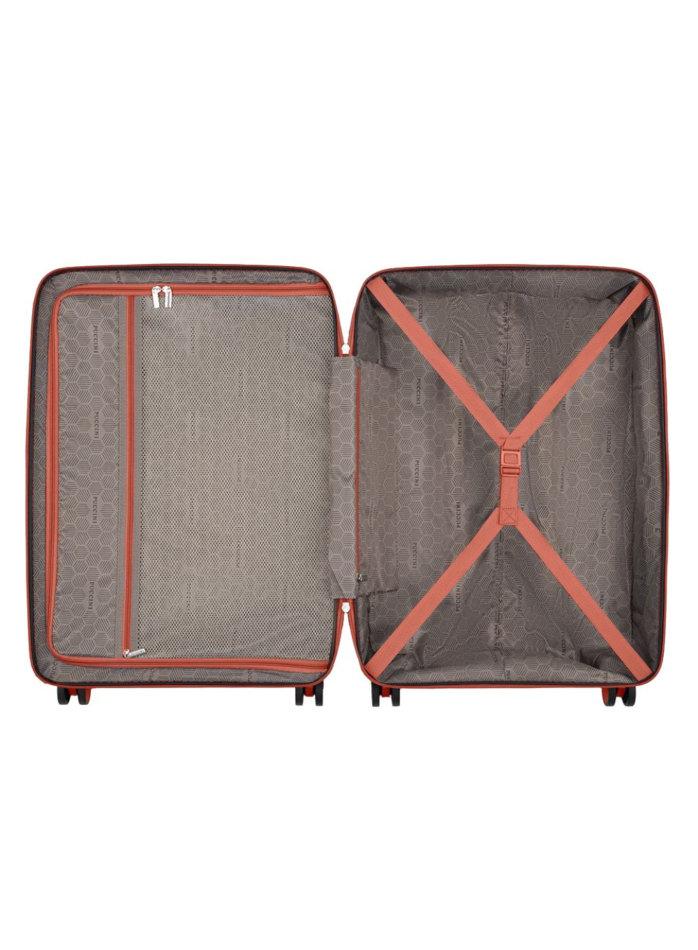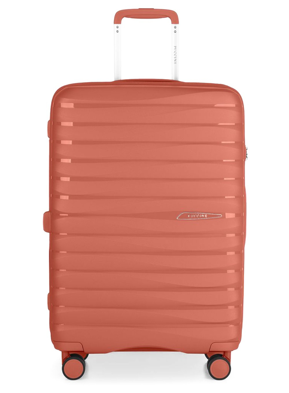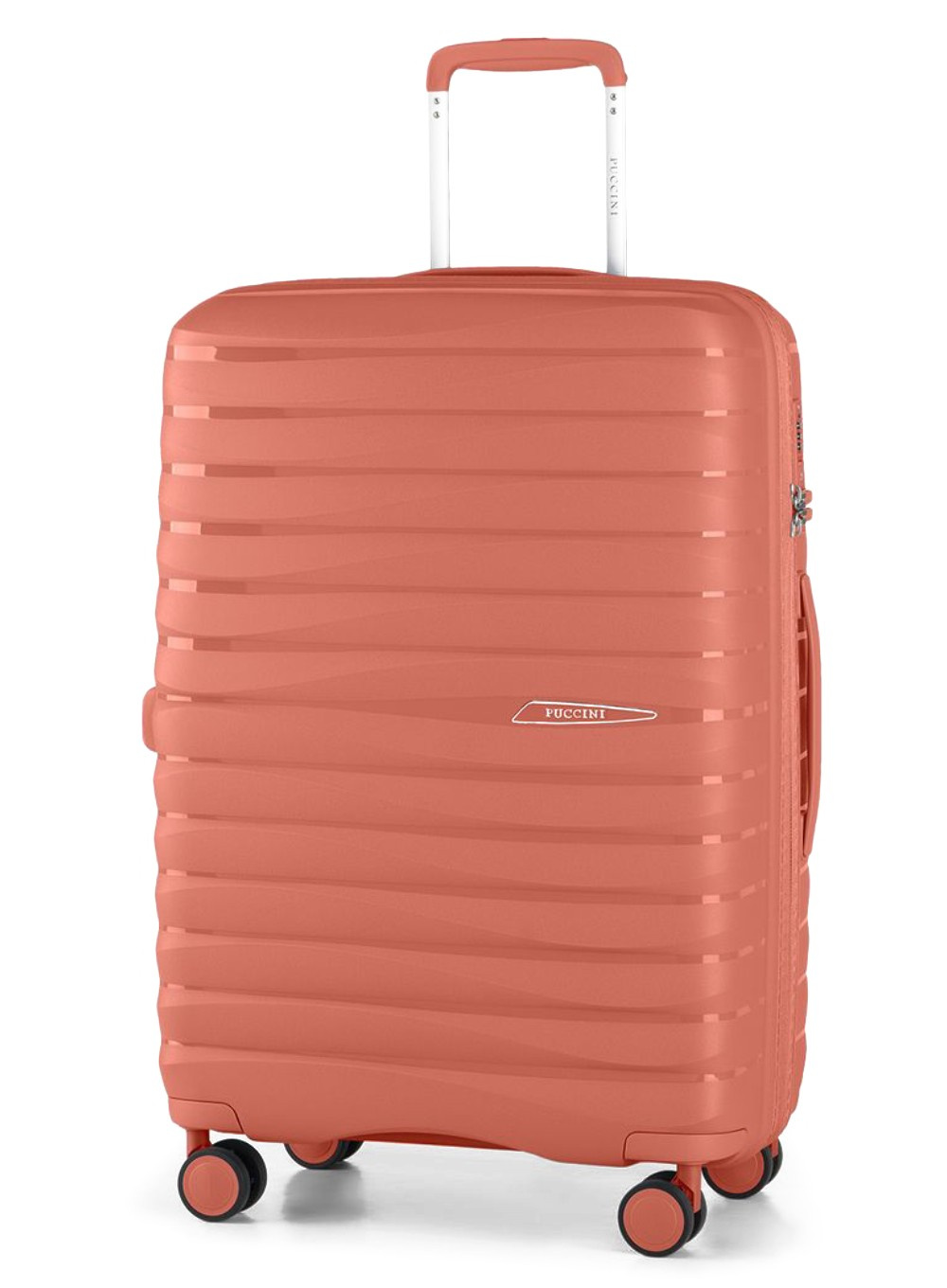 Średnia walizka podróżna Puccini Mauritius wykonana z trwałego polipropylenu, ma niską wagę, 4 zwrotne koła i pojemne dwukomorowe wnętrze.