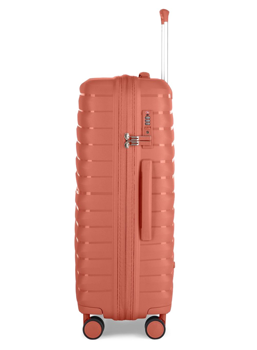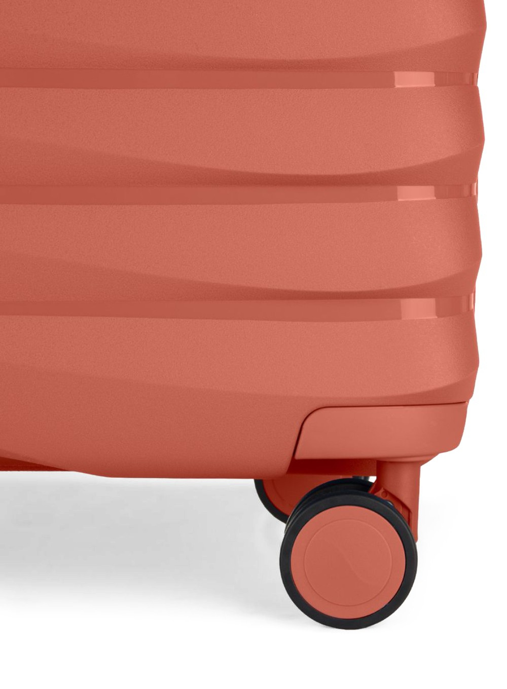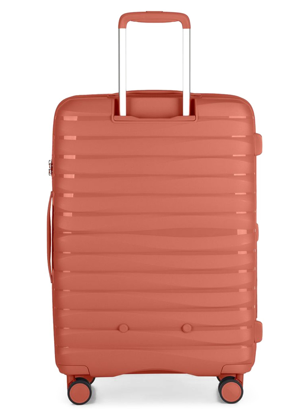 Średnia walizka podróżna Puccini Mauritius wykonana z trwałego polipropylenu, ma niską wagę, 4 zwrotne koła i pojemne dwukomorowe wnętrze.