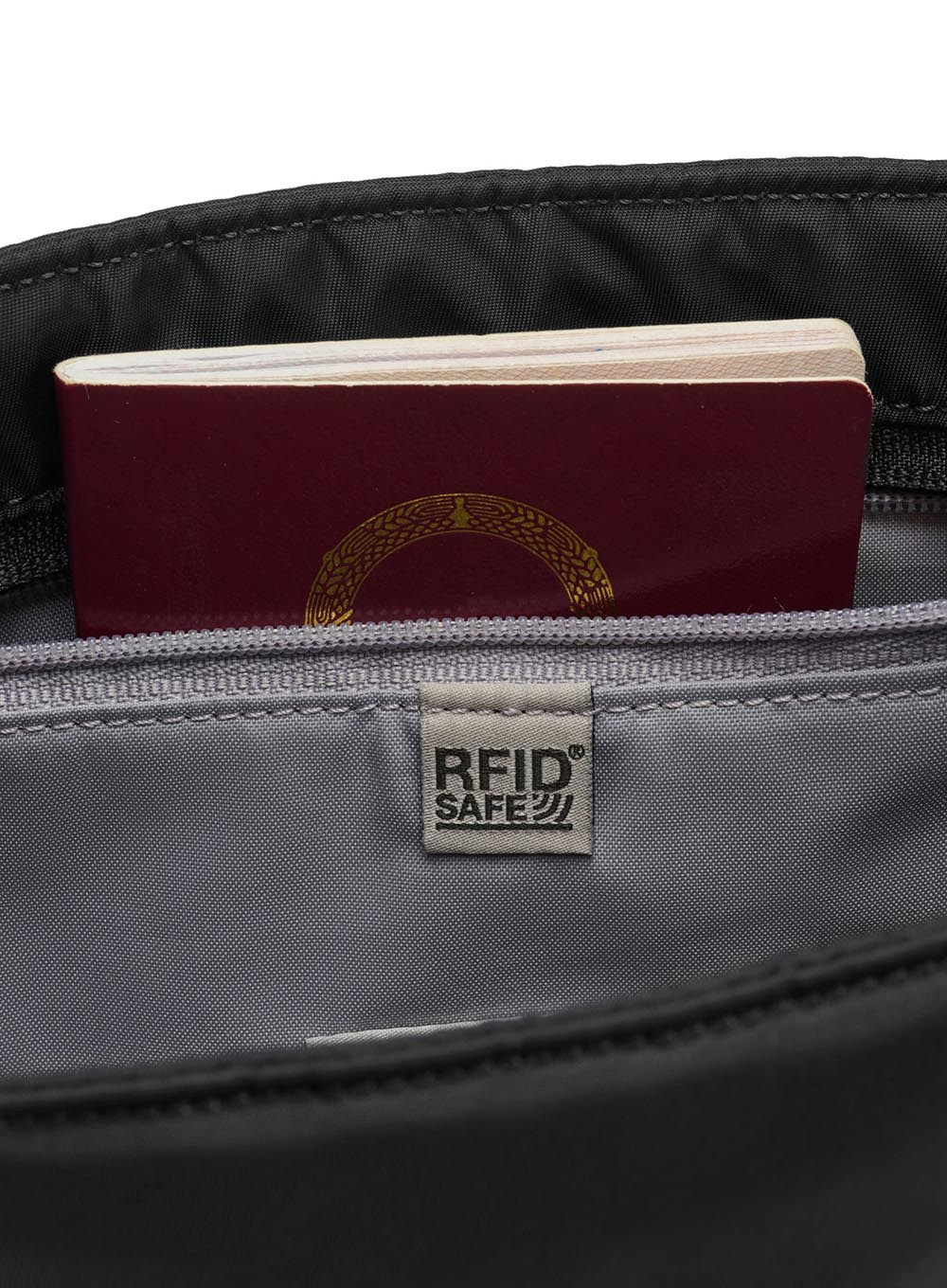 - Duża kieszeń RFID, w której zmieści się dłuższe portfel, karty kredytowe i paszport (ochrona przed kradzieżą danych osobowych)