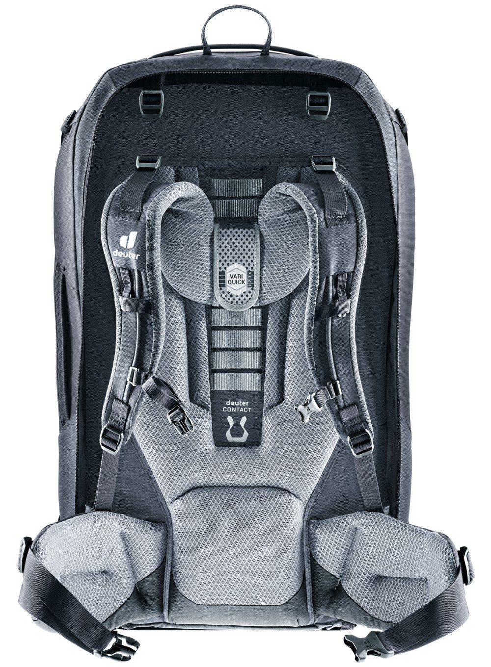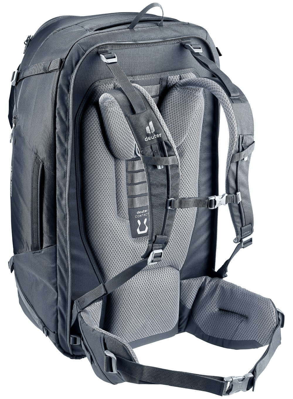Deuter Contact to system nośny, który gwarantuje idealne dopasowanie dla różnych długości pleców dzięki wielostopniowemu systemowi regulacji VariQuick. System Contact to elastyczna rama X-Frame, ergonomicznie ukształtowane poduszki przylegające do pleców i poduszki na pasie biodrowym, które równomiernie rozkładają ciężar ładunku, odciążając plecy. Kanały między poduszkami, a także oddychająca, solidna podszewka 3D Airmesh zapewniają przyjemną wentylację.