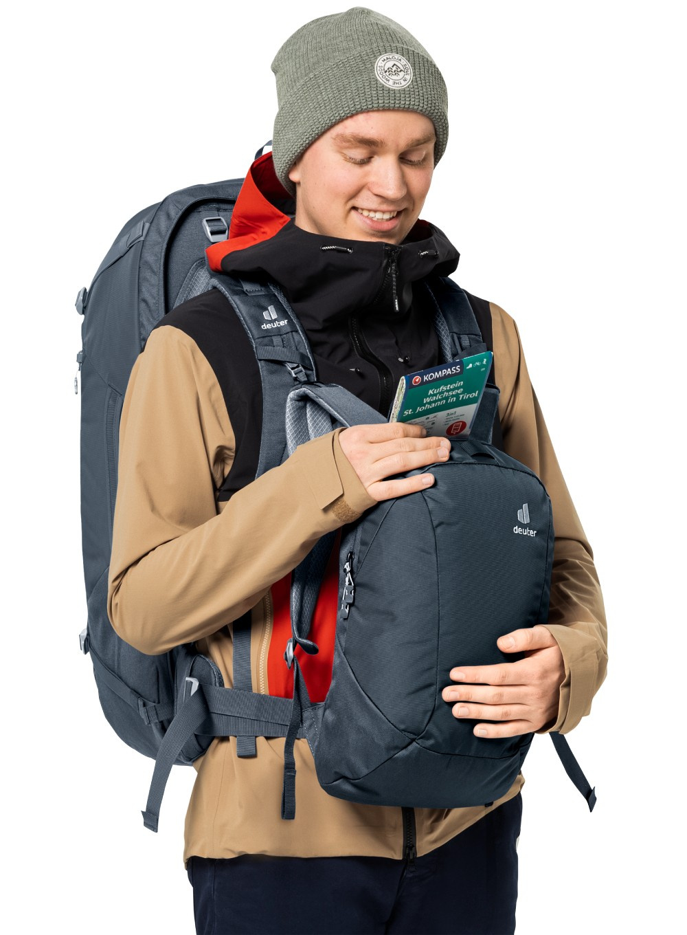 Podczas spontanicznych wycieczek możesz zostawić główny plecak w pokoju i zabrać tylko najpotrzebniejsze rzeczy w małym plecaku dziennym, który także posiada komfortowy system nośny Contact. W czasie podróży możesz przymocować plecak dzienny do szelek głównego plecaka i nosić go z przodu, co ułatwia szybki dostęp do cennych przedmiotów, paszportu itp.
