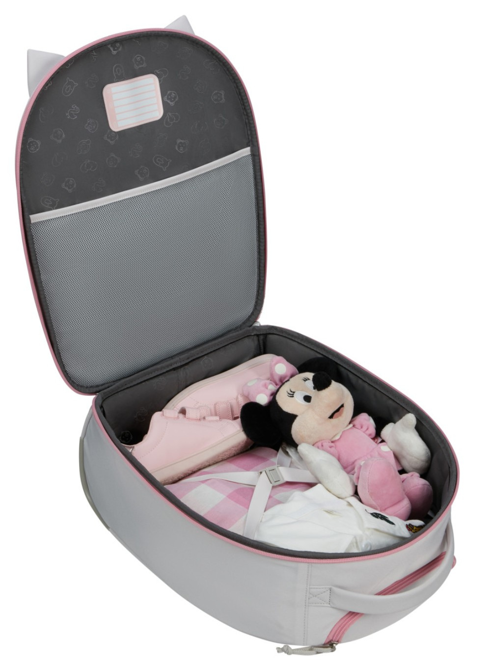 Walizka Samsonite Happy Sammies na ubrania, bieliznę i przybory toaletowe, zabawki, książeczki ma wyściełaną i zapinaną na zamek komorę oraz wewnętrzną kieszeń z siatki. 2 elastyczne paski motylkowe zapewniają dobre mocowanie złożonego ubrania podczas podróży.