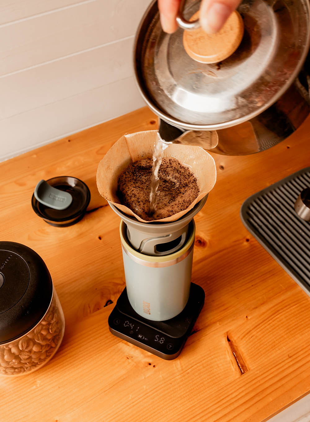- Program pour-over: automatyczne obliczanie i wyświetlanie proporcji kawy do wody dla idealnego naparu