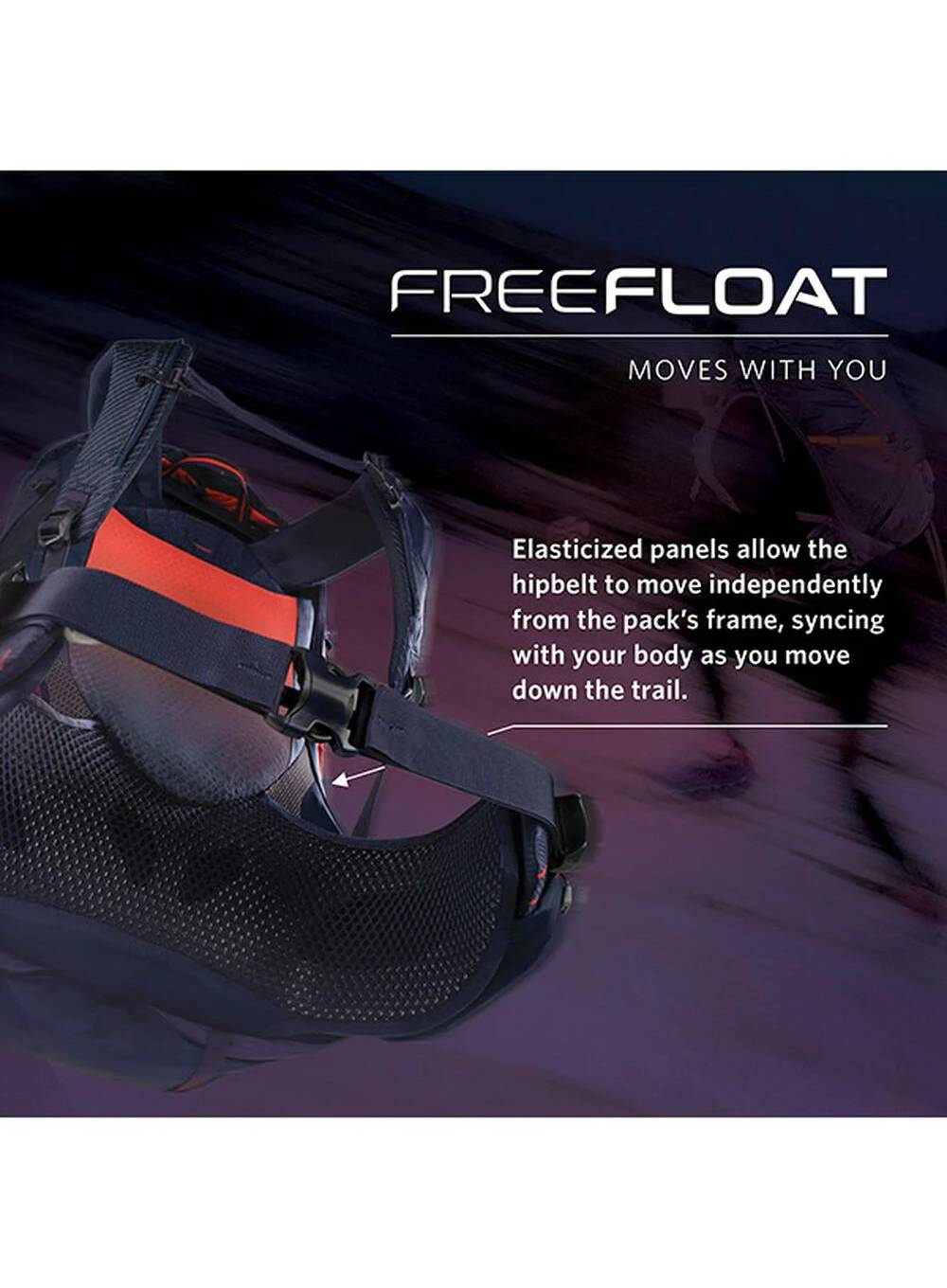 Dynamiczny pas biodrowy FreeFloat porusza się wraz z ciałem, eliminując punkty nacisku i poprawiając stabilność na szlaku.
