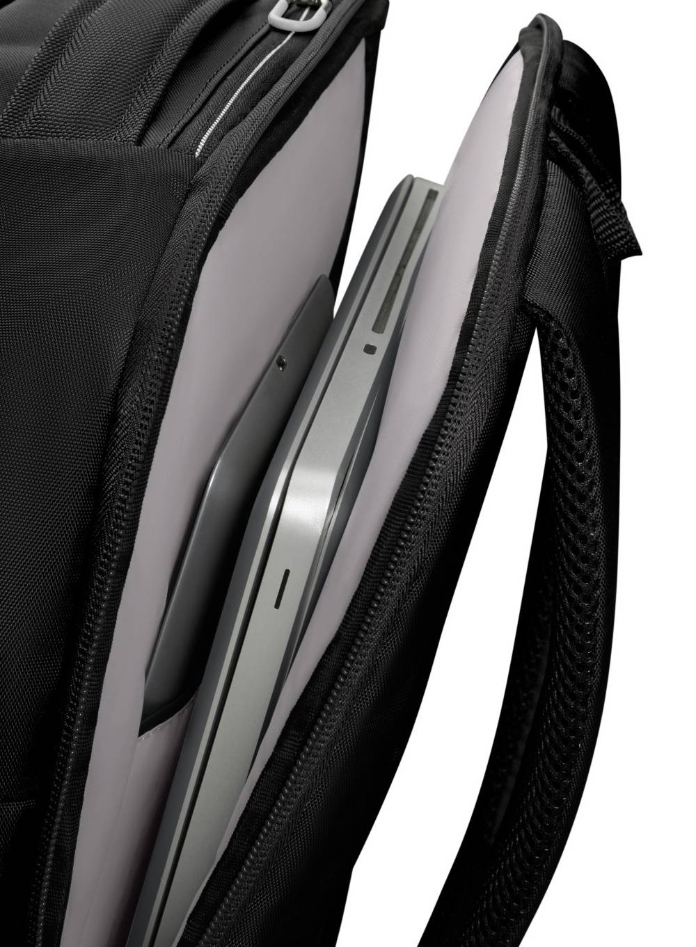 Samsonite Guardit Classy Underseater M ma w pełni wyściełaną komorę zapinaną na zamek błyskawiczny z dwoma elastycznymi paskami mocującymi. Dwie małe kieszenie zapinane na suwak pozwalają na uporządkowanie mniejszych przedmiotów, akcesoriów do włosów lub przyborów toaletowego. Z tyłu druga, w pełni wyściełana komora pozwala na bezpieczne przenoszenie komputera 14,1 cala. Jest tam również wyściełana kieszeń odpowiednia na tablet.