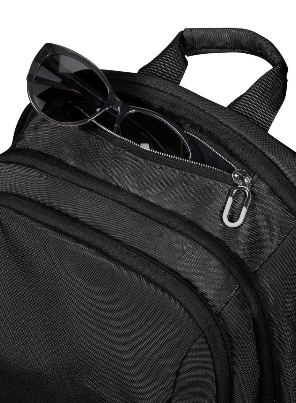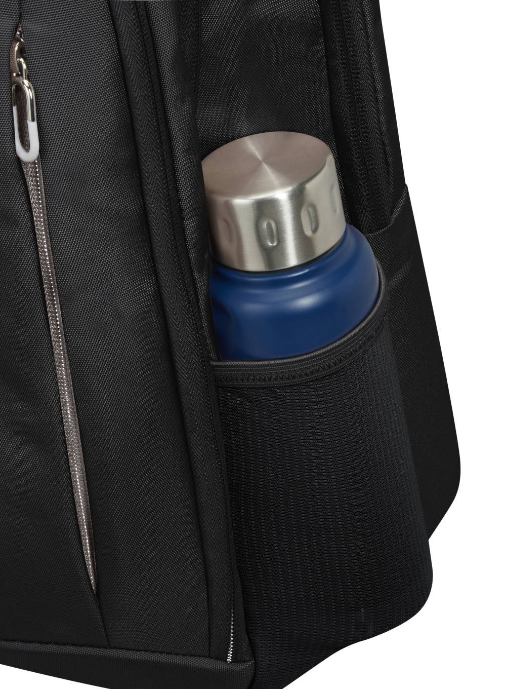 Plecak Samsonite Guardit Classy ma 2 funkcjonalne komory. Jedna pozwala na przenoszenie np. profesjonalnych dokumentów, luźnych kartek czy teczek, druga zaś, w pełni wyściełana, idealnie nadaje się na komputer o przekątnej do 15,6 cala. Ponadto w komorze tej znajduje się wzmocniona kieszeń na tablet. Na akcesoria multimedialne, portfel i dokumenty możesz wybrać przestronną przednią kieszeń zapinaną na zamek, wyposażoną w różne kieszenie, aby uprościć organizację. Na górze mała kieszonka na zamek z podszewką z polaru odpornego na zarysowania, jest idealna na okulary lub telefon. Po bokach znajdują się również 2 kieszenie na butelki.