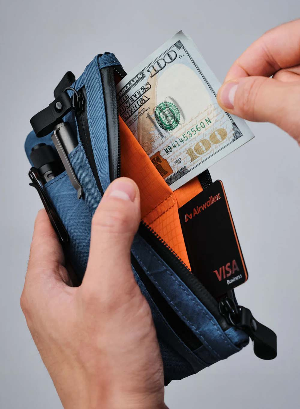 Saszetka posiada trzy zewnętrzne kieszenie, które umożliwiają szybki dostęp do najczęściej używanych przedmiotów, takich jak telefon, długopis czy multitool. Wewnątrz znajduje się trzy kieszonki, które pomagają uporządkować karty, banknoty i inne drobiazgi.
