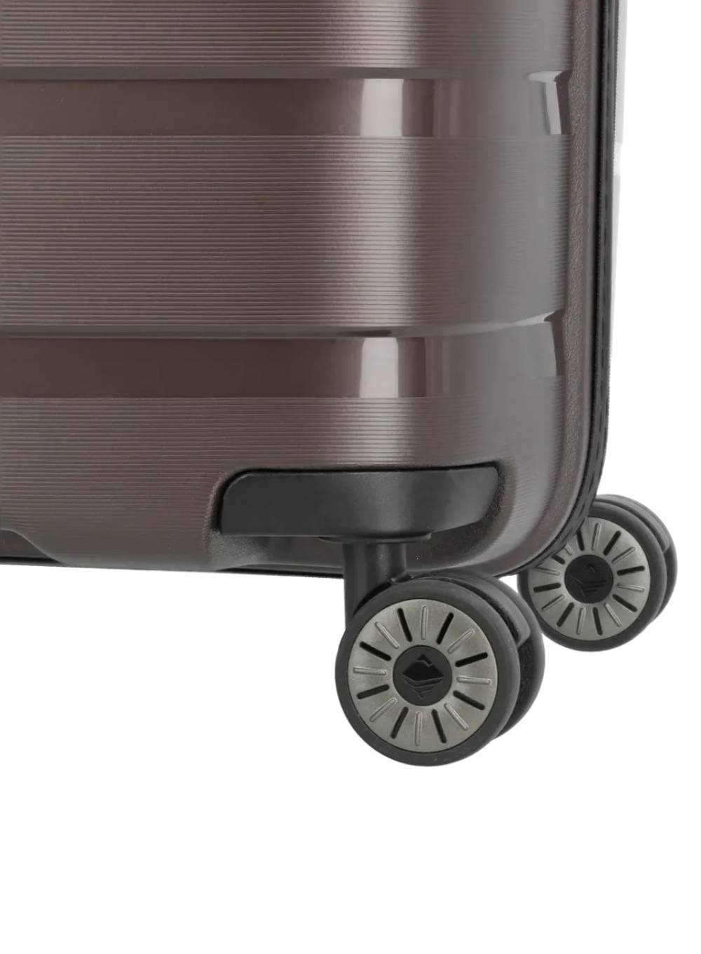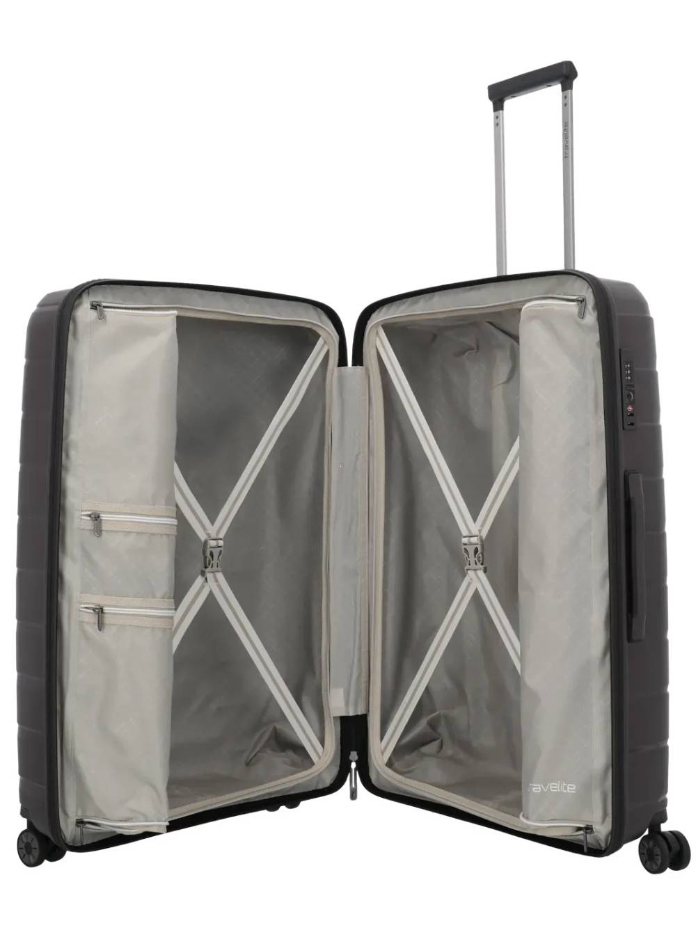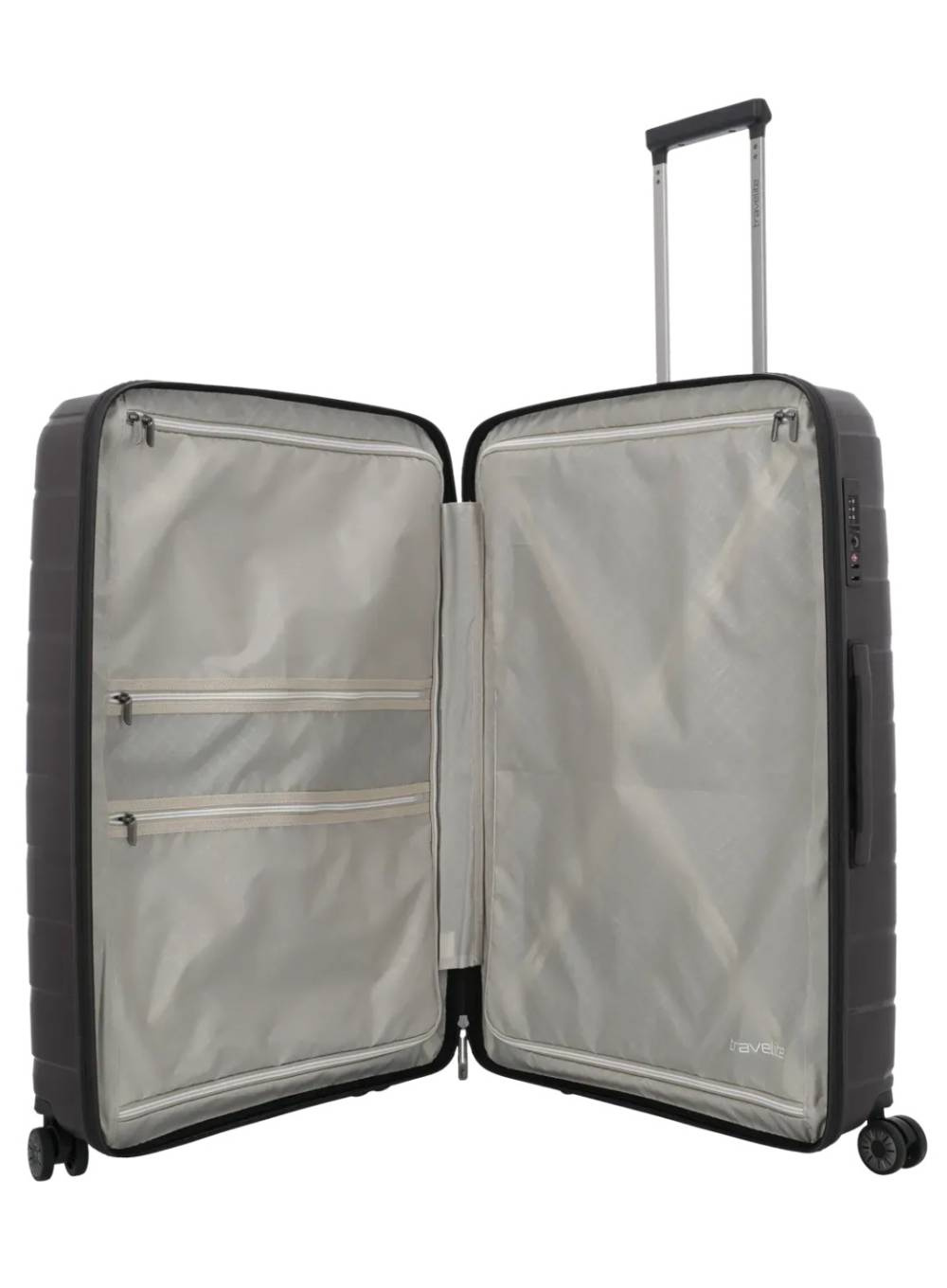 Duża walizka Travelite Air Base to walizka dla najbardziej wymagających użytkowników. Zastosowano w niej wysokiej jakości polipropylen i jednocześnie ograniczono wagę do minimum. System jezdny oparty jest na 4 podwójnych kółkach, które gwarantują bezproblemową jazdę z bagażem.