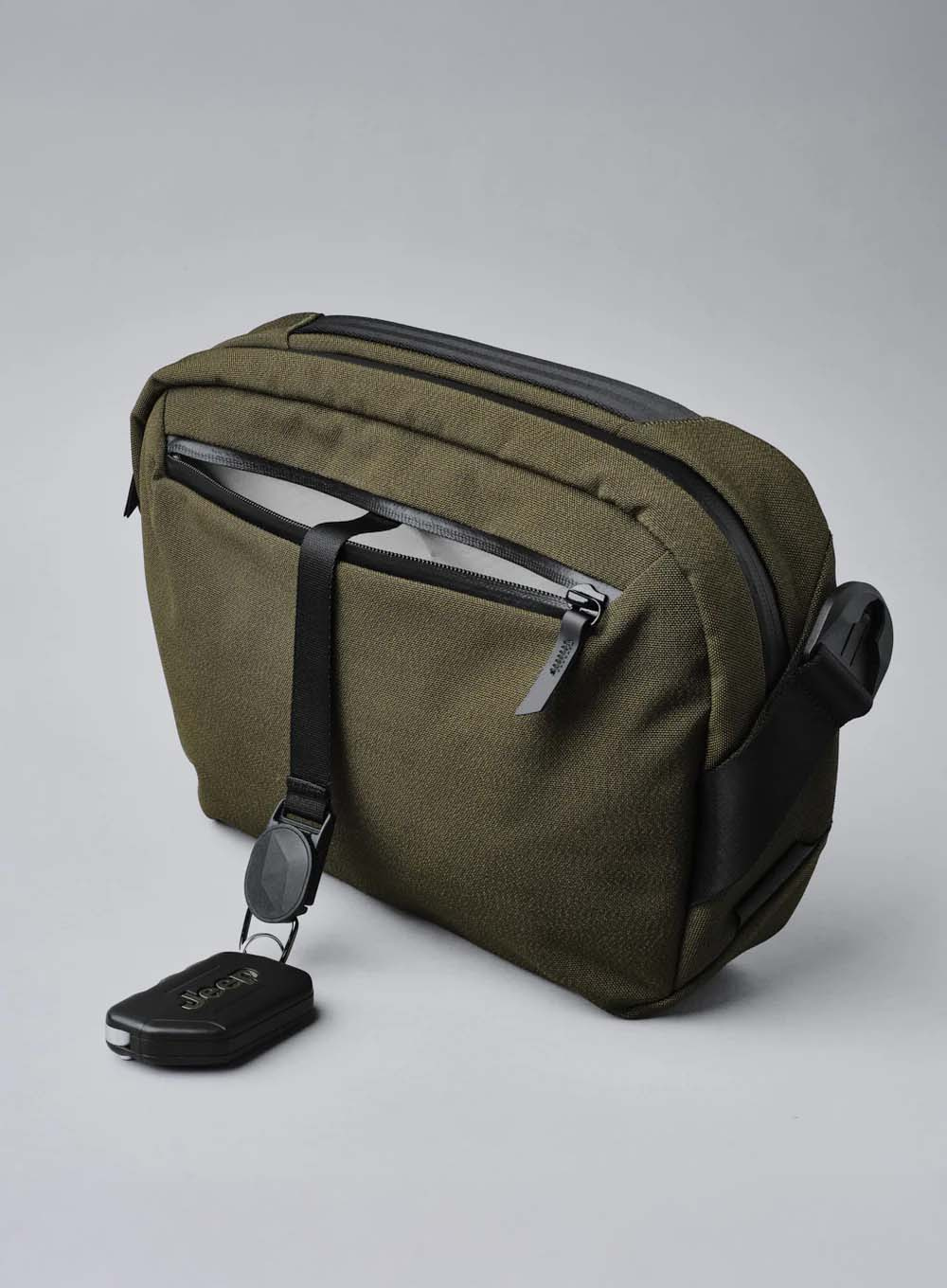 Torba posiada trzy ciche, wodoodporne zamki YKK i wyściełane wnętrze z lekkiej, wytrzymałej podszewki ripstop. Przednia kieszeń została wyposażona w magnetyczny uchwyt na klucze MOD Key Tether, a główna komora oferuje miękką kieszeń na tablet (do 11 cali), dwie siateczkowe i dwie standardowe kieszenie na mniejsze akcesoria. Tylna kieszeń to idealne miejsce na paszport, telefon lub inne cenne rzeczy.
