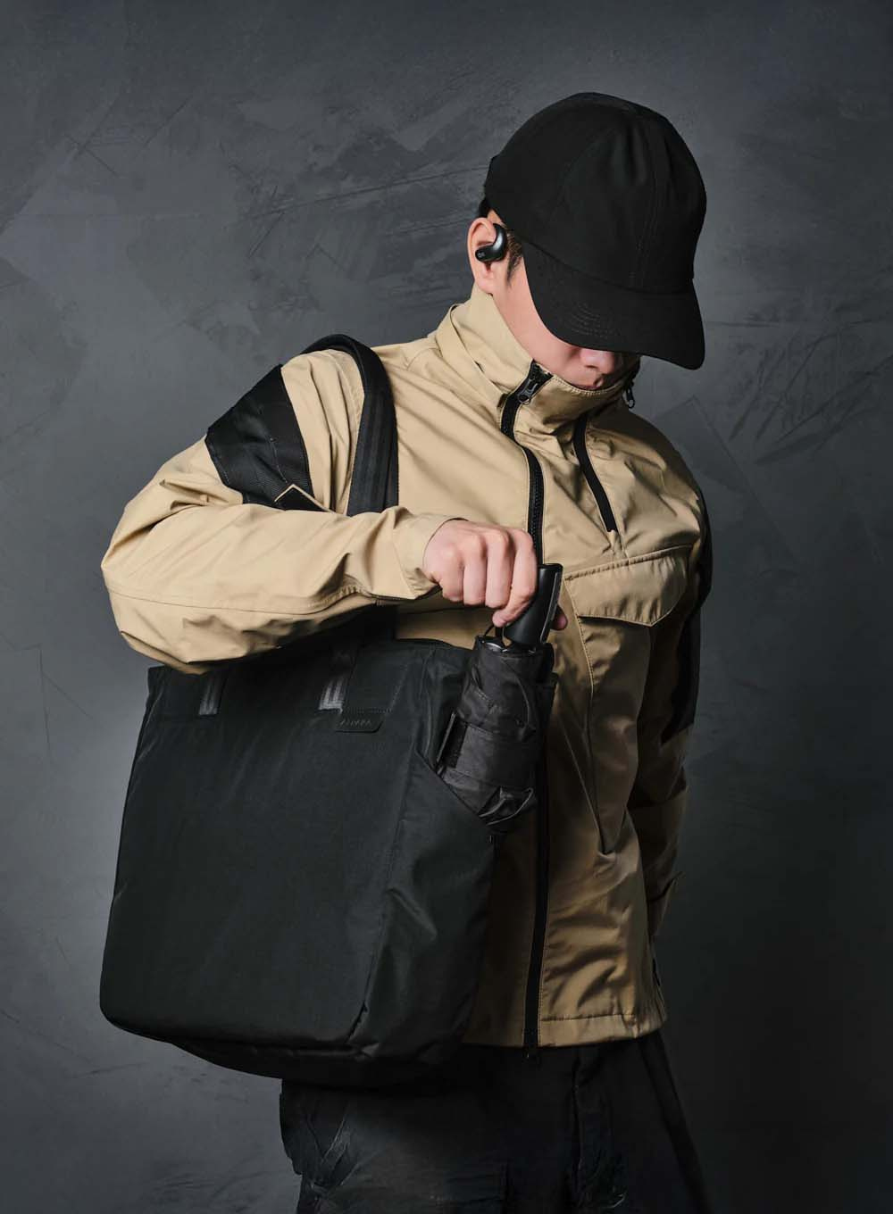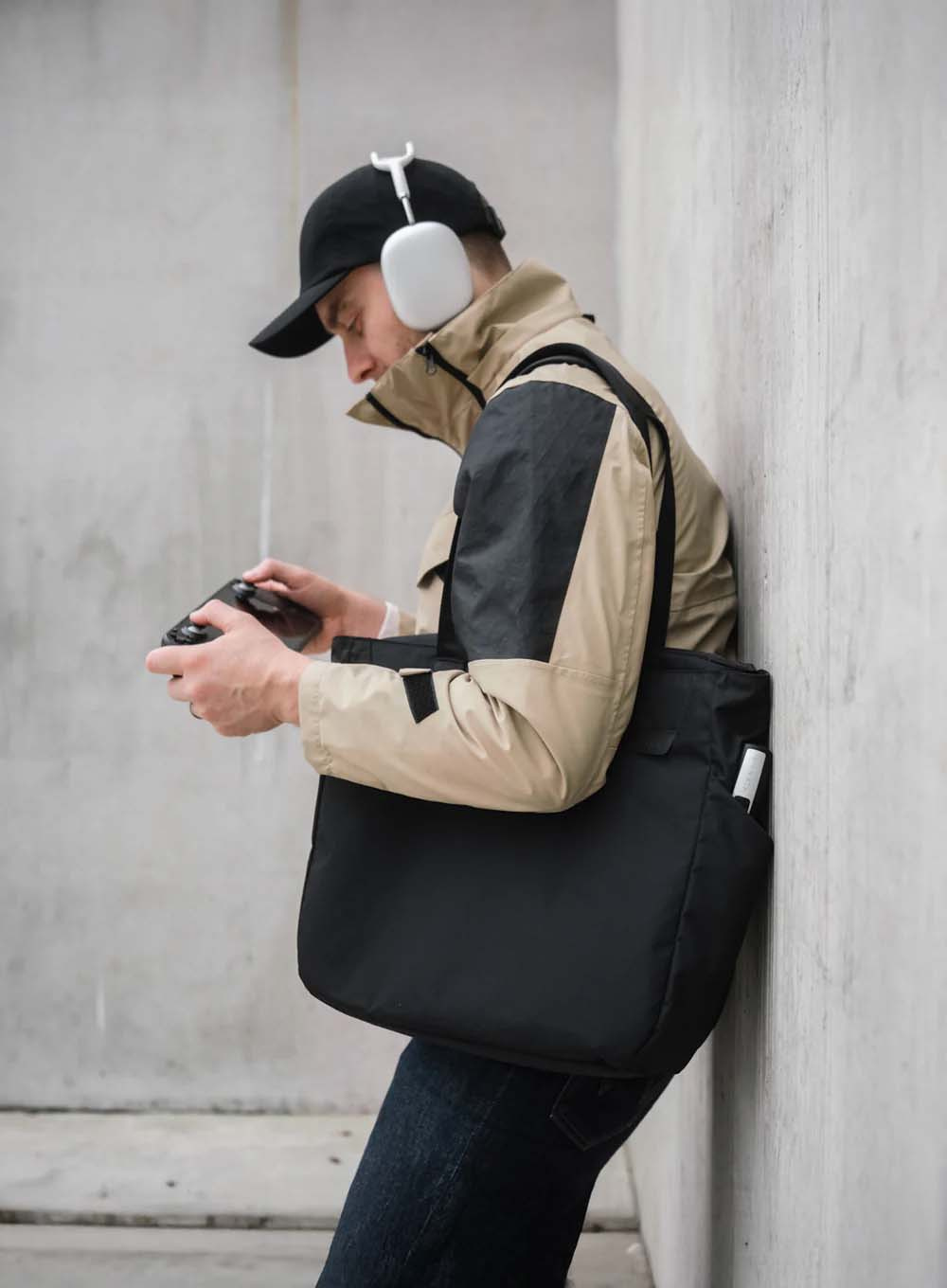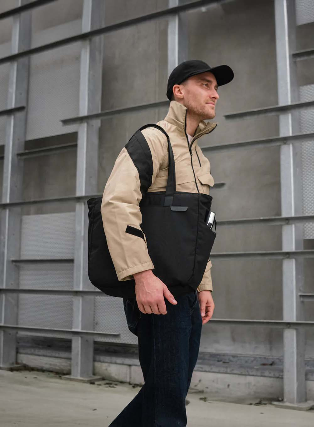 Torba została wykonana z ekologicznej i wodoodpornej tkaniny Axoflux®, dzięki czemu skutecznie chroni zawartość przed deszczem i trudami miejskiego życia. W środku znajduje się miękka, wyściełana przegroda na laptopa i tablet, pasująca do MacBooka Pro 16". Przemyślana organizacja kieszeni pozwala na wygodne przechowywanie niezbędnych akcesoriów, takich jak telefon, klucze czy dokumenty.