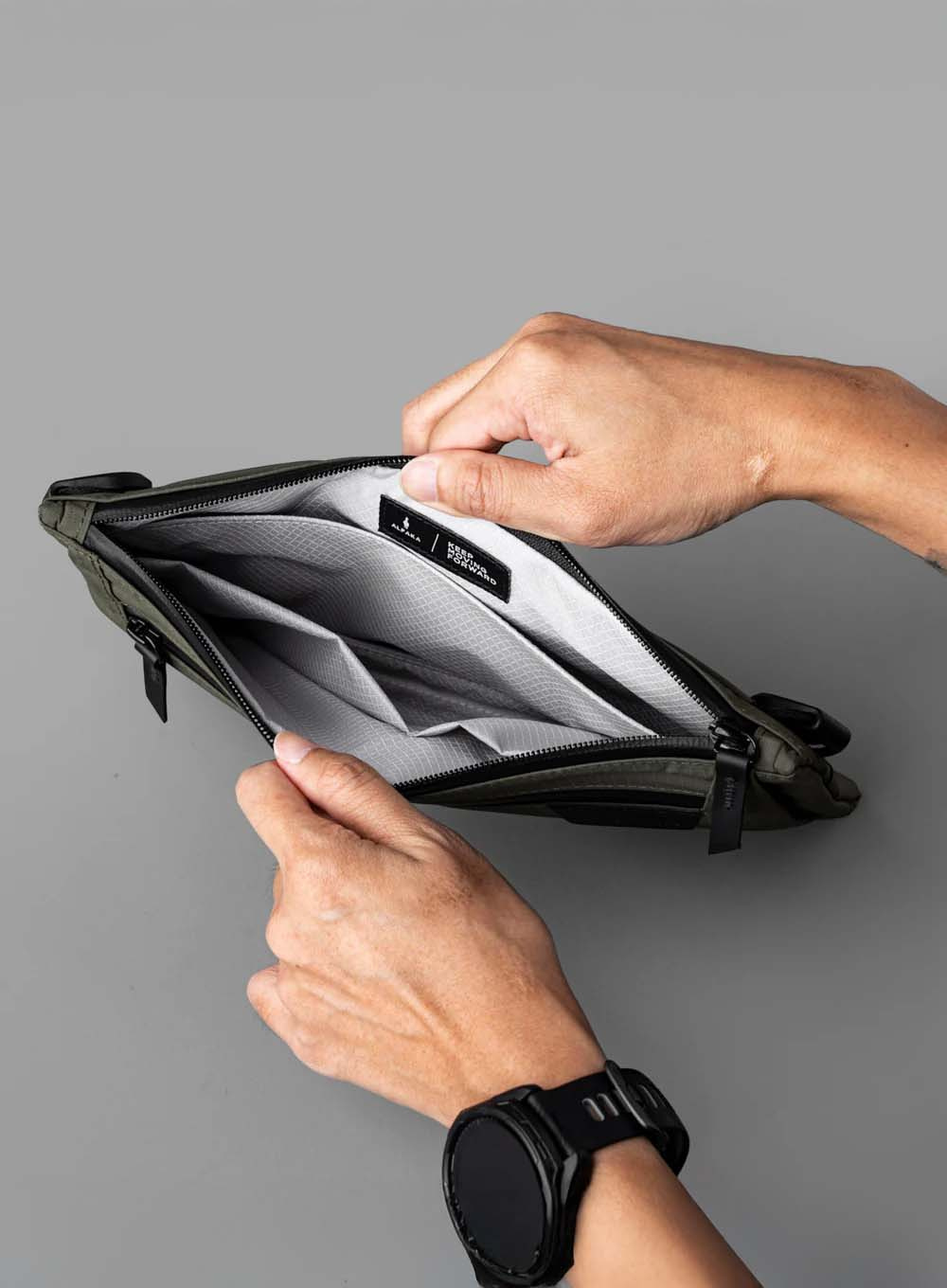 Dzięki odpinanemu paskowi na ramię z magnetycznym zapięciem Maglockz możesz nosić Zip Pouch Max V2 jako wygodny sling bag - na ukos, na ramieniu lub w ręce. Smukła sylwetka pozwala na dyskretne przechowywanie pod kurtką lub w plecaku bez zbędnej objętości.