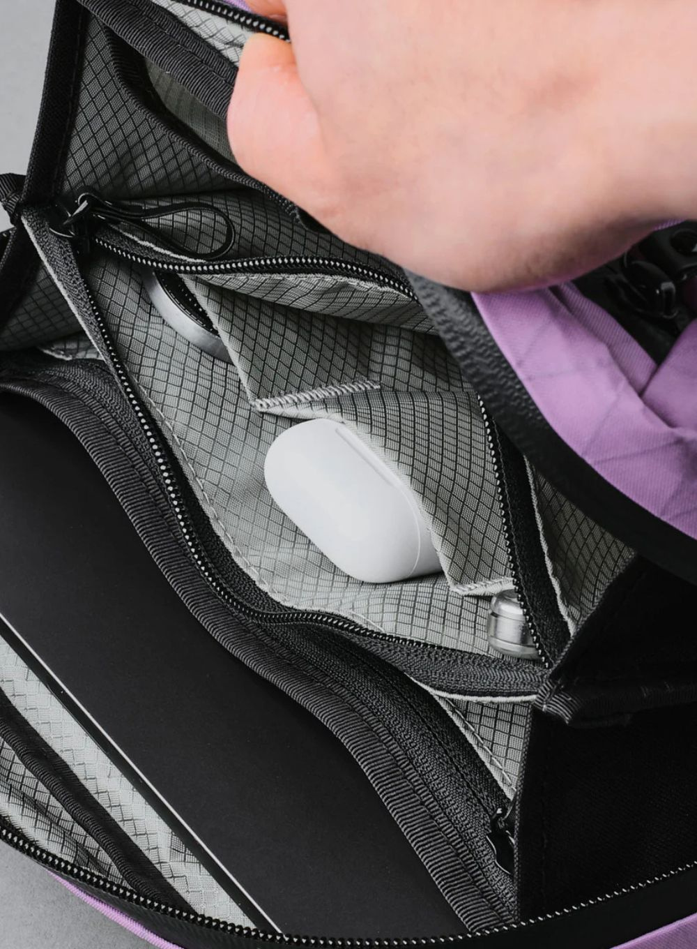Wykonane z hydrofobowego materiału X-Pac®, który jest zarówno trwały, jak i ekologiczny. Zamki YKK zapewniają ochronę przed deszczem, a specjalny system przepustów na kable umożliwia ładowanie urządzeń w trakcie podróży.