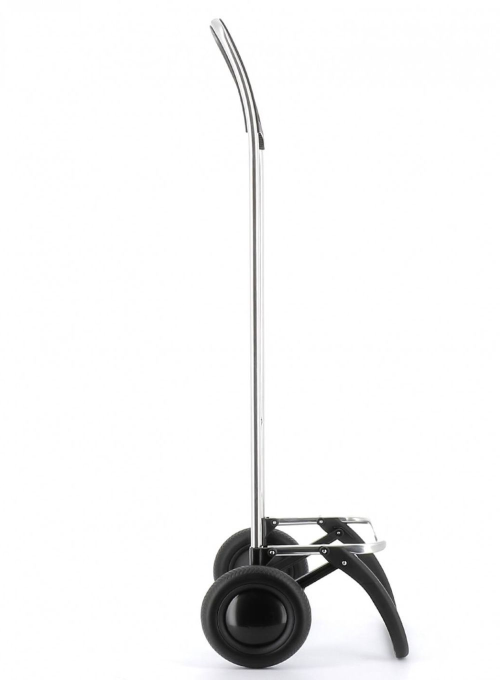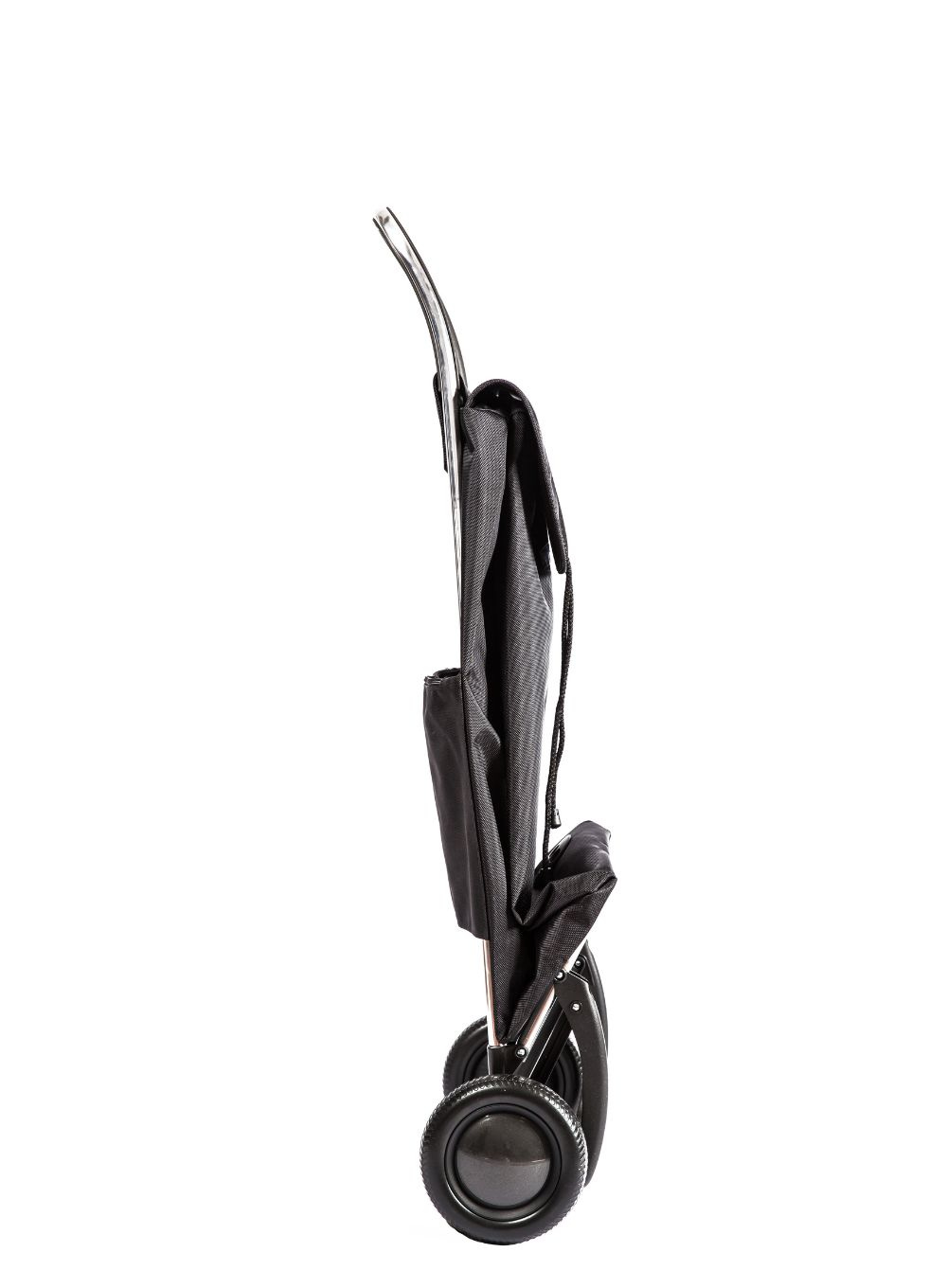Aluminiowy wózek na zakupy na 2 kółkach. Składana dolna podstawa i podpórka przednia. Po złożeniu zajmuje niewiele miejsca. Torba o dużej pojemności, dwie kieszenie wewnętrzne i tylna kieszeń zapinana na zamek.