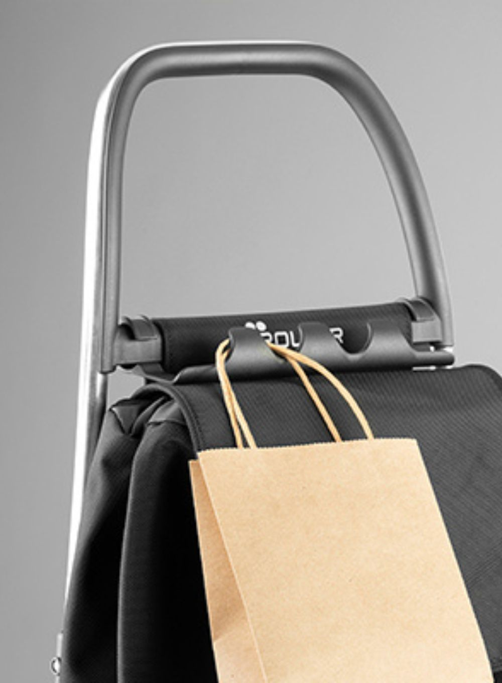 • Poręczny uchwyt pozwala nieść złożony wózek w ręce, w drodze na zakupy, a w trakcie zakupów nie musisz nosić wózka w ręku, dzięki innowacyjnemu zaczepowi (adapterowi) zaczepisz go o wózek marketowy