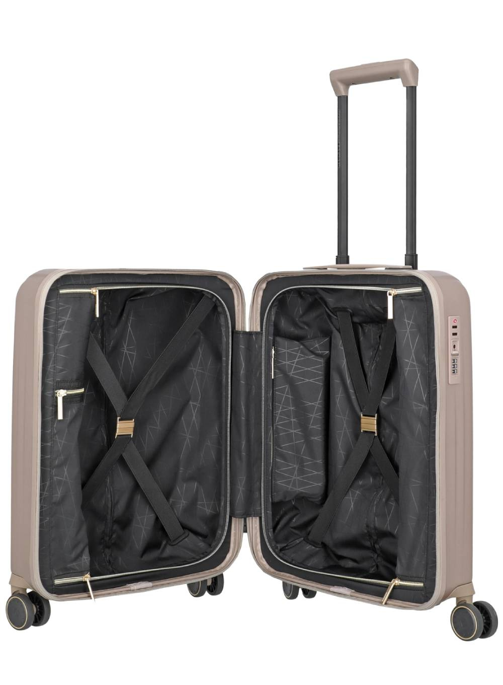 Pomimo niewielkich rozmiarów, wnętrze walizki zostało zaprojektowane z myślą o maksymalnym komforcie pakowania. Trzy kieszenie zapinane na suwak, pasy mocujące oraz osobny worek na buty lub bieliznę pozwalają zachować porządek. Dodatkowo, wyjmowana szkatułka na biżuterię to praktyczny i stylowy akcent, który doceni każda podróżująca kobieta.