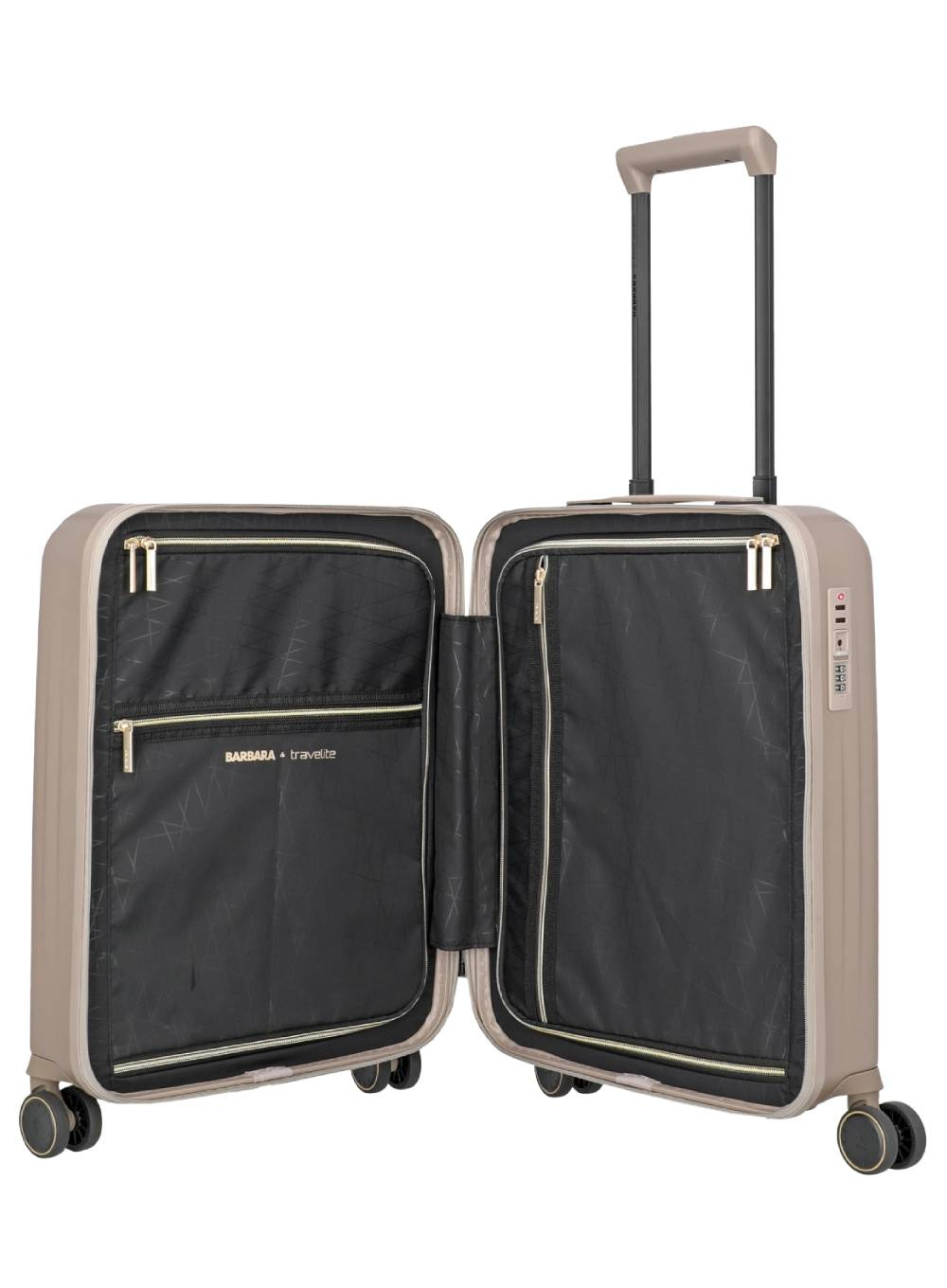 Walizka kabinowa Travelite Barbara Novelty to funkcjonalność i elegancja w kompaktowej formie. Idealna jako bagaż podręczny, sprawdzi się zarówno podczas weekendowych wypadów, jak i krótkich wyjazdów biznesowych. Jej unikalny design z metalowymi detalami i złotymi akcentami podkreśla nowoczesny, kobiecy styl.
