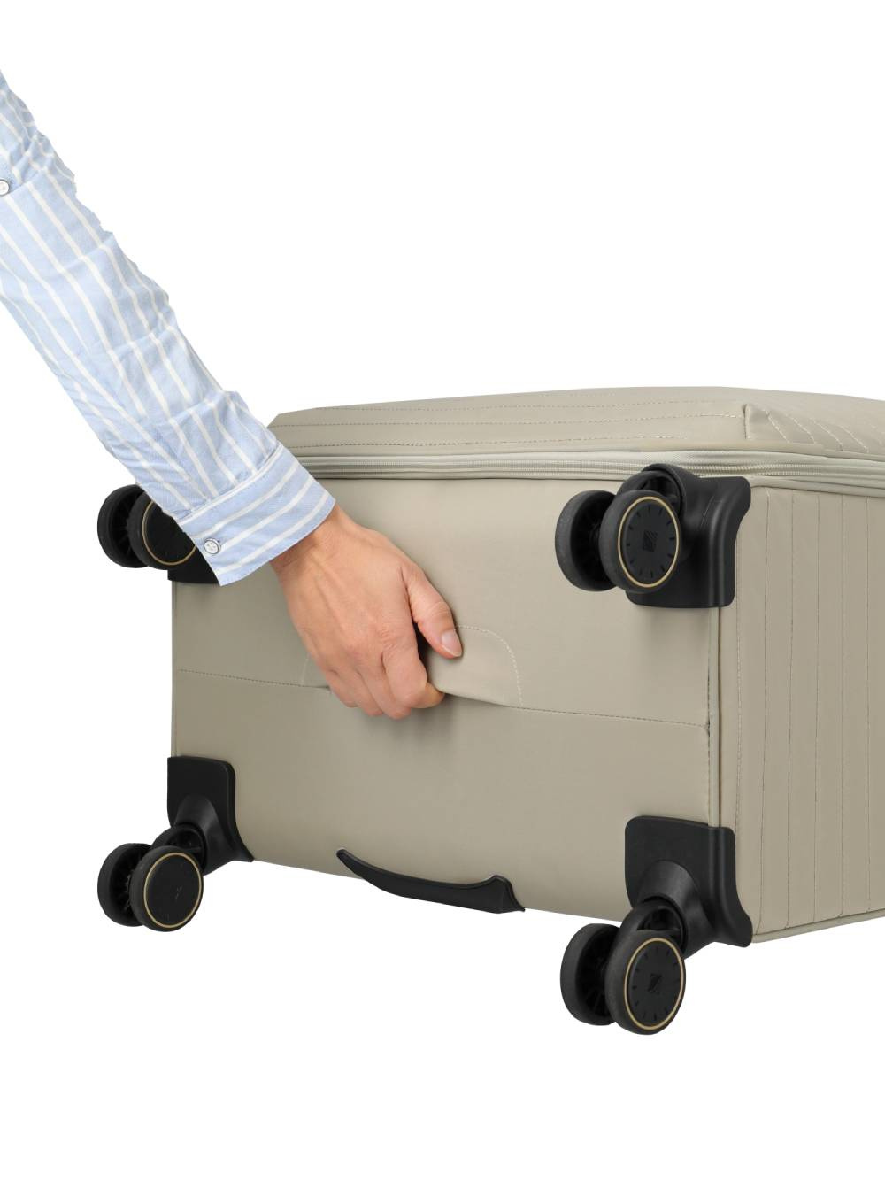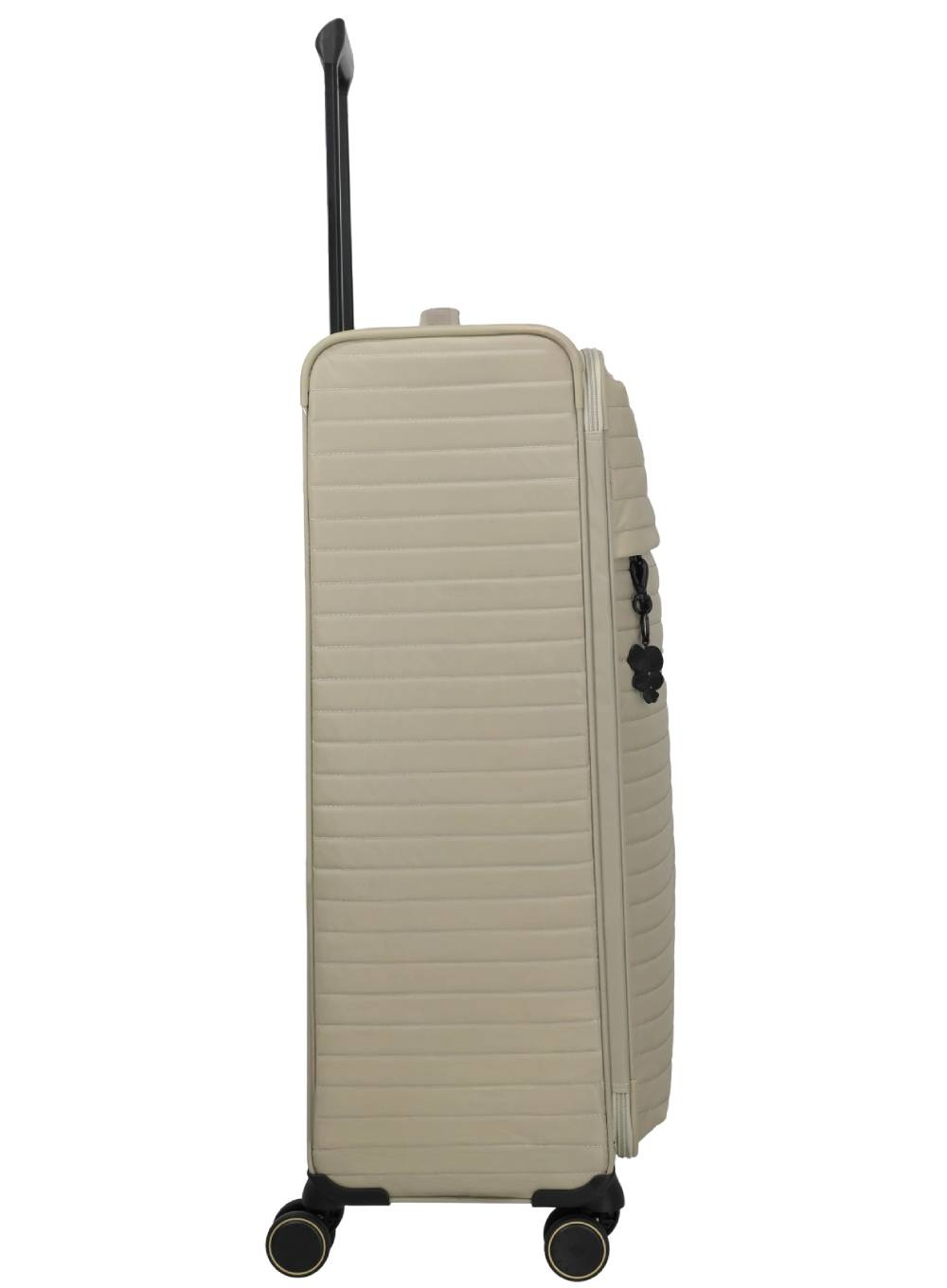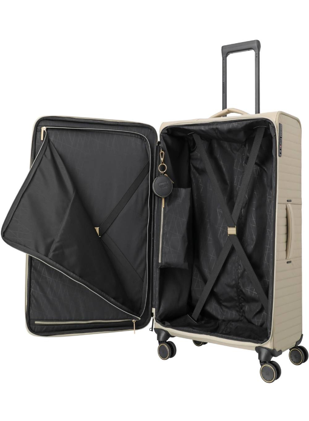 Wnętrze walizki zostało zaprojektowane z dbałością o szczegóły: dwie kieszenie zapinane na suwak, elastyczne pasy z ozdobnymi detalami, osobny worek na obuwie lub bieliznę oraz wyjmowana szkatułka na biżuterię pozwolą uporządkować wszystko z klasą. Dodatkowym udogodnieniem są podwójne kółka oraz specjalna osłona dolnej krawędzi z wbudowanym uchwytem, które zapewniają komfort manewrowania nawet przy pełnym obciążeniu.