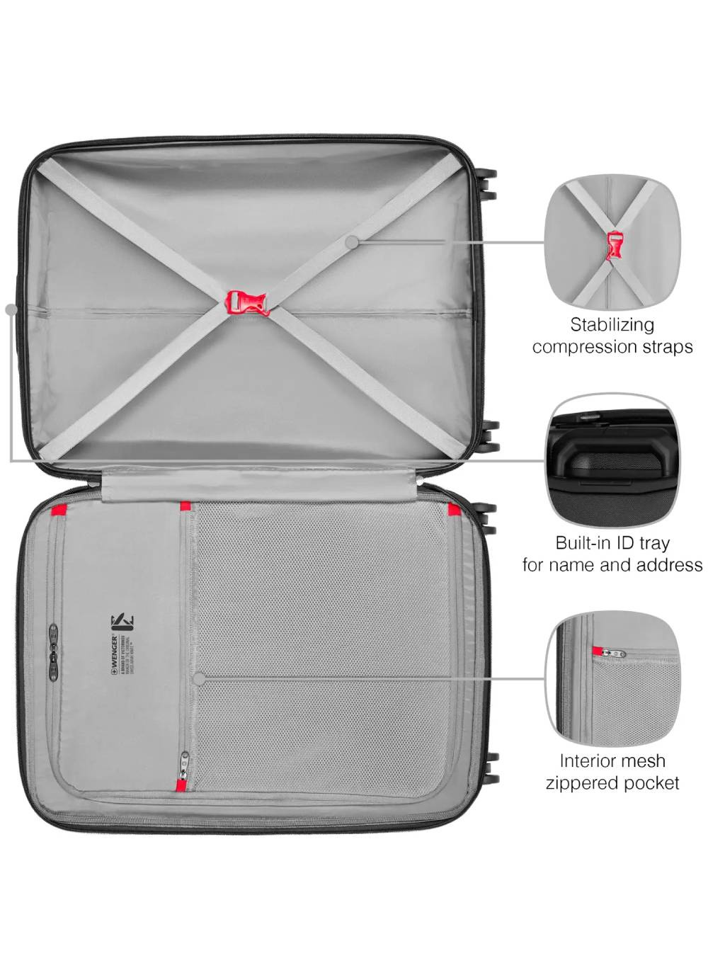 Cztery podwójne, cicho toczące się kółka oraz teleskopowa rączka zapewniają łatwe manewrowanie w każdym otoczeniu. Walizka posiada również zintegrowane uchwyty ułatwiający przenoszenie. Wnętrze zostało wyposażone w elastyczne pasy kompresyjne, zasuwana przegrodę z materiału i siatkową kieszeń zapinaną na zamek, co ułatwia organizację bagażu.
