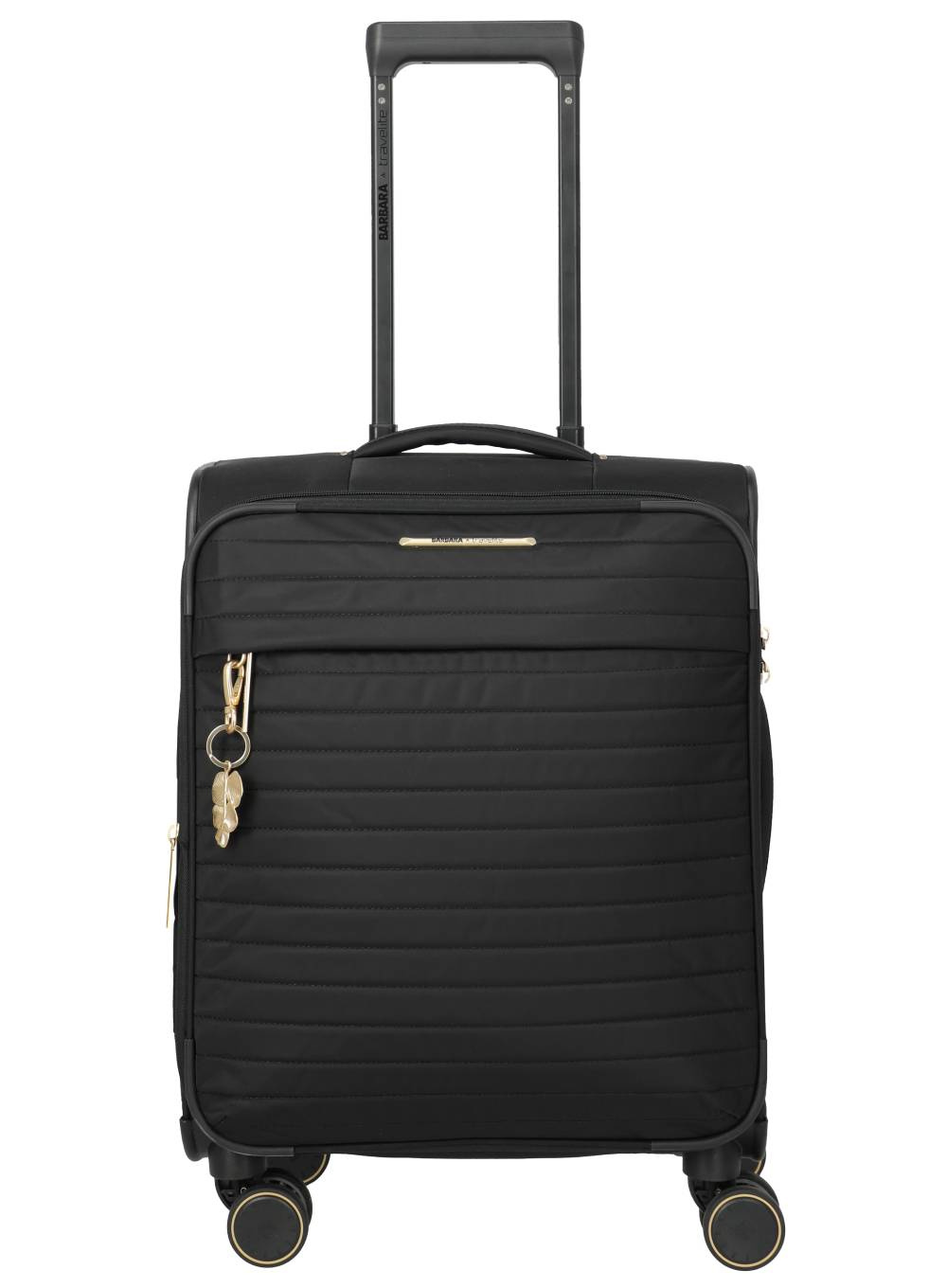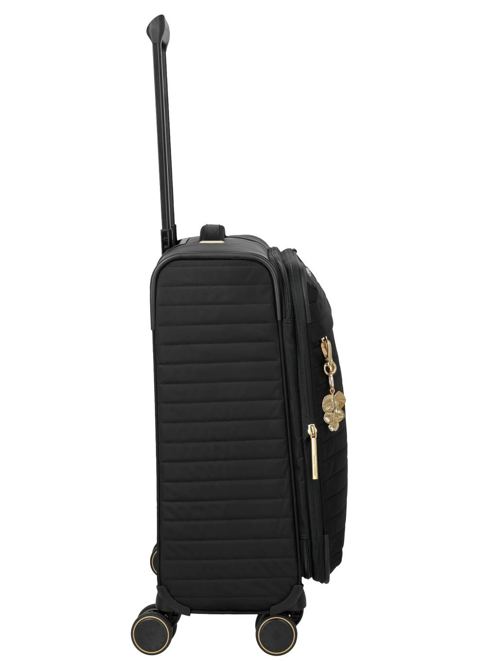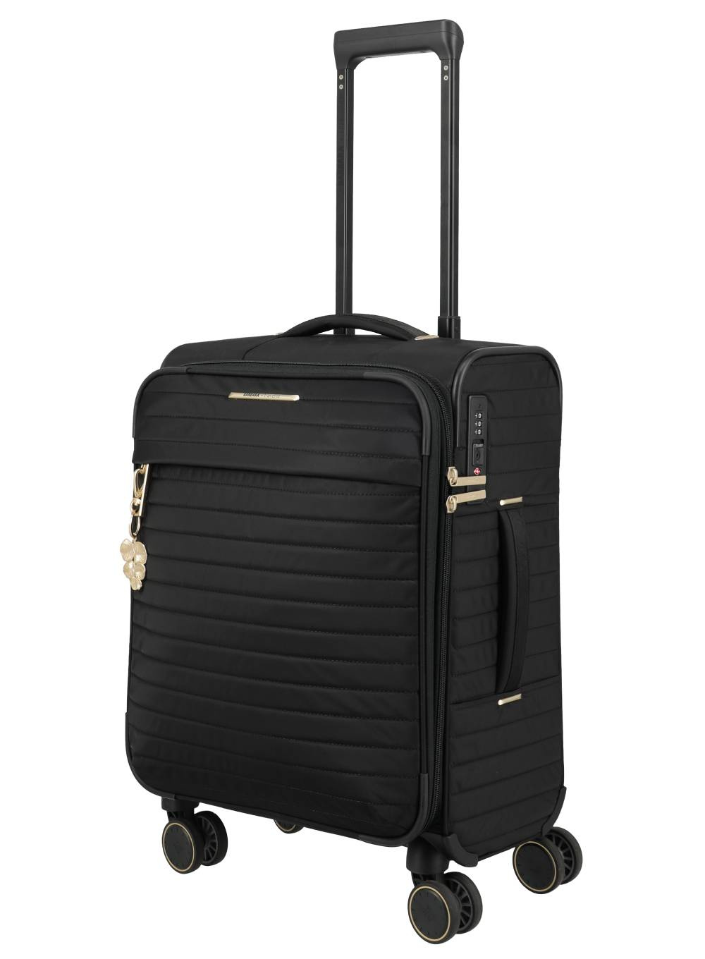 Zewnętrzne wykończenie uzupełniają błyszczące metalowe elementy, złote akcenty na paskach mocujących oraz ozdobny brelok, który pełni funkcję modnego dodatku. Zintegrowany zamek TSA zadba o bezpieczeństwo Twoich rzeczy podczas podróży lotniczych.