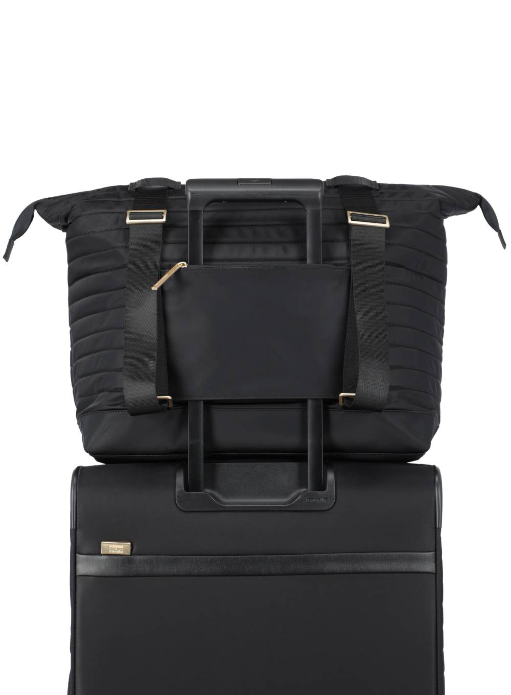 Torba posiada szerokie otwarcie ułatwiające pakowanie i dostęp do zawartości. W środku znajduje się zamykana kieszeń oraz funkcjonalny system mocowania, umożliwiający przypięcie np. kurtki lub maty do jogi. Dodatkowa kieszeń zapinana na zamek oraz możliwość zamocowania torby na walizce dzięki funkcji clip-on czynią ją idealnym towarzyszem w podróży i codziennym użytkowaniu.