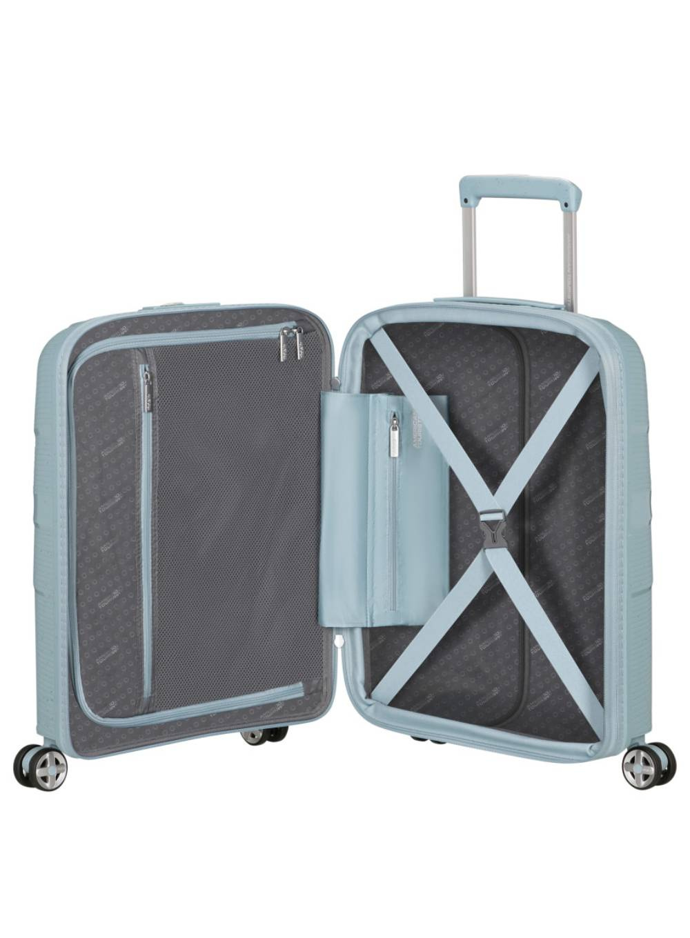 Mała walizka American StarVibe ma wnętrze podzielone na dwie komory, wysuwany uchwyt teleskopowy, uchwyt na górze, zintegrowany zamek szyfrowy TSA dla bezpiecznych podróży do USA i funkcje poszerzenia, jeśli potrzebujemy parę litrów ekstra.