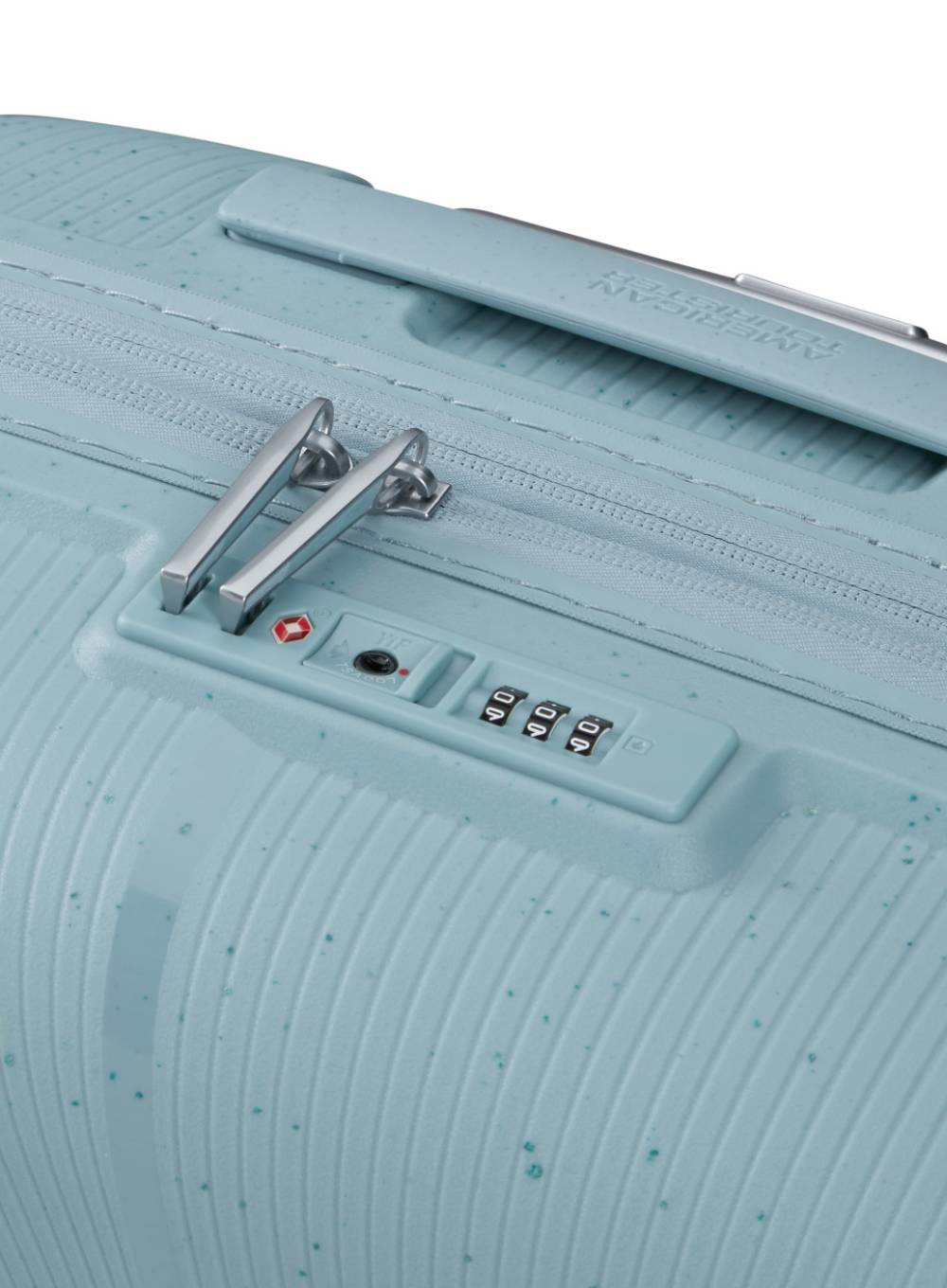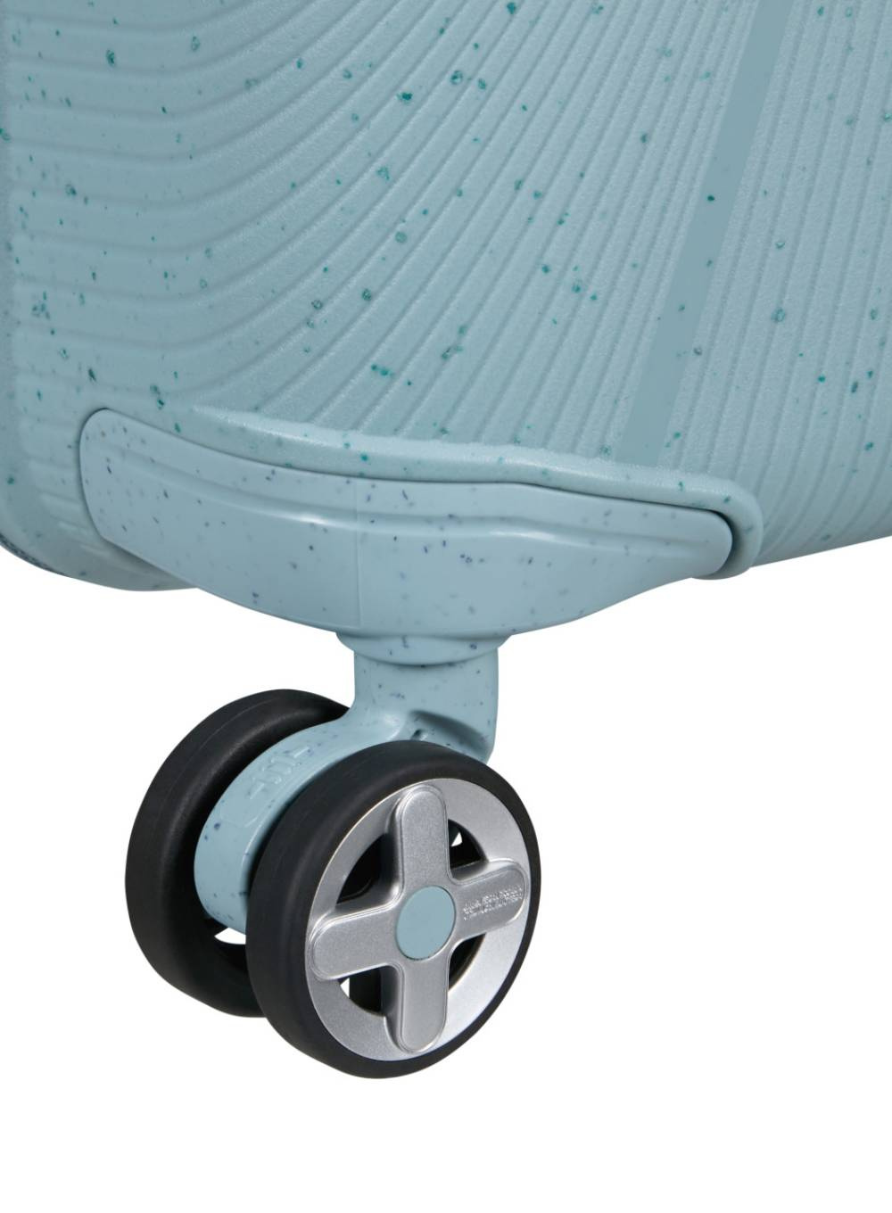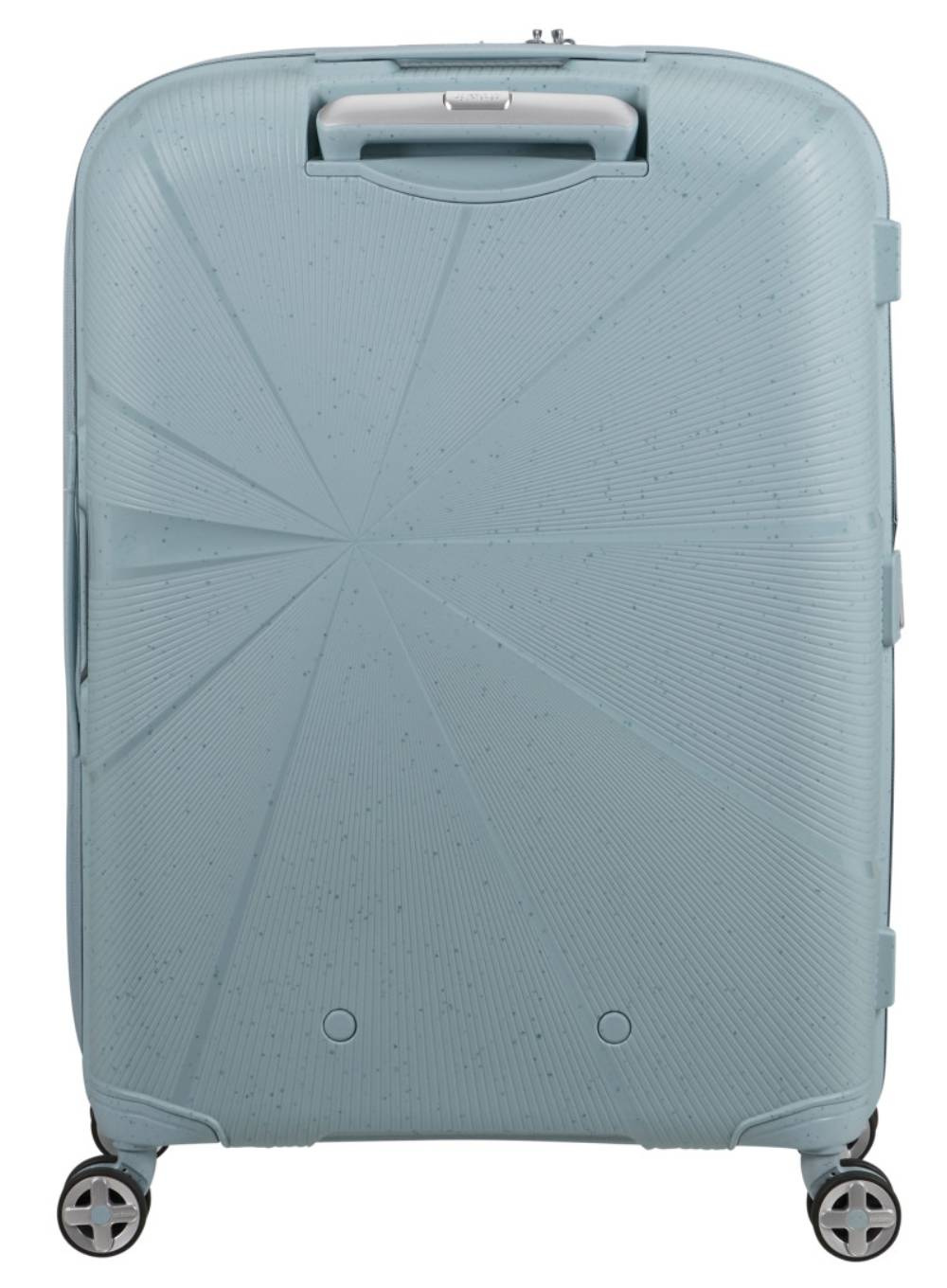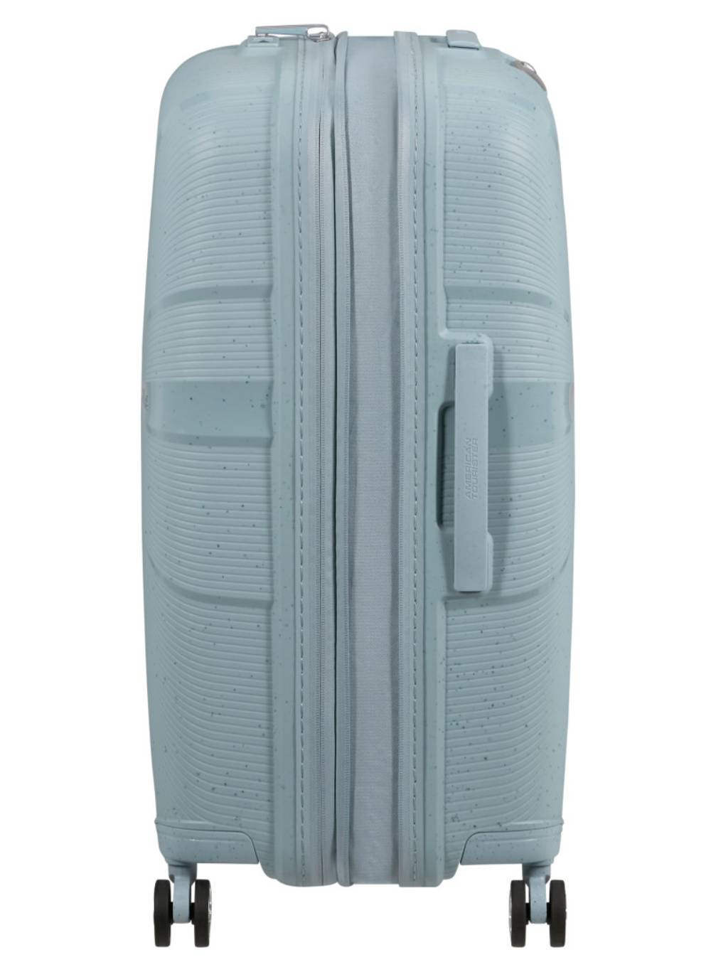 American Tourister StarVibe to nowoczesna średnia walizka poszerzana stworzona z myślą o komforcie podróżowania i dbałości o środowisko. Jej zewnętrzna powłoka w 83% wykonana jest z przetworzonego polipropylenu pochodzącego z recyklingu, co przekłada się na trwałość oraz lekkość konstrukcji. Wnętrze walizki, włącznie z podszewką, zamkami oraz elementami rozszerzającymi, zostało w 100% wykonane z plastiku PET z recyklingu, co odpowiada wykorzystaniu 24 butelek po 500 ml.