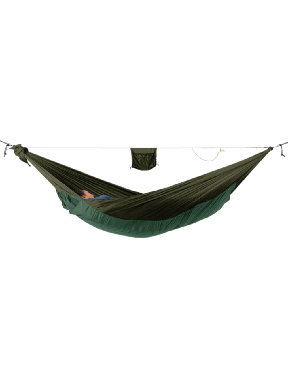 Zintegrowana, regulowana linka (ridgeline) gwarantuje optymalne naprężenie i komfortową pozycję wypoczynku. Dodatkowo organizer pełniący rolę torby transportowej może również służyć jako praktyczny dyfuzor światła. W zestawie znajdują się dwa ultralekkie karabinki 6kN, umożliwiające szybki montaż. Zalecane zawieszenie przy użyciu pasków Moon Straps (niedołączone).