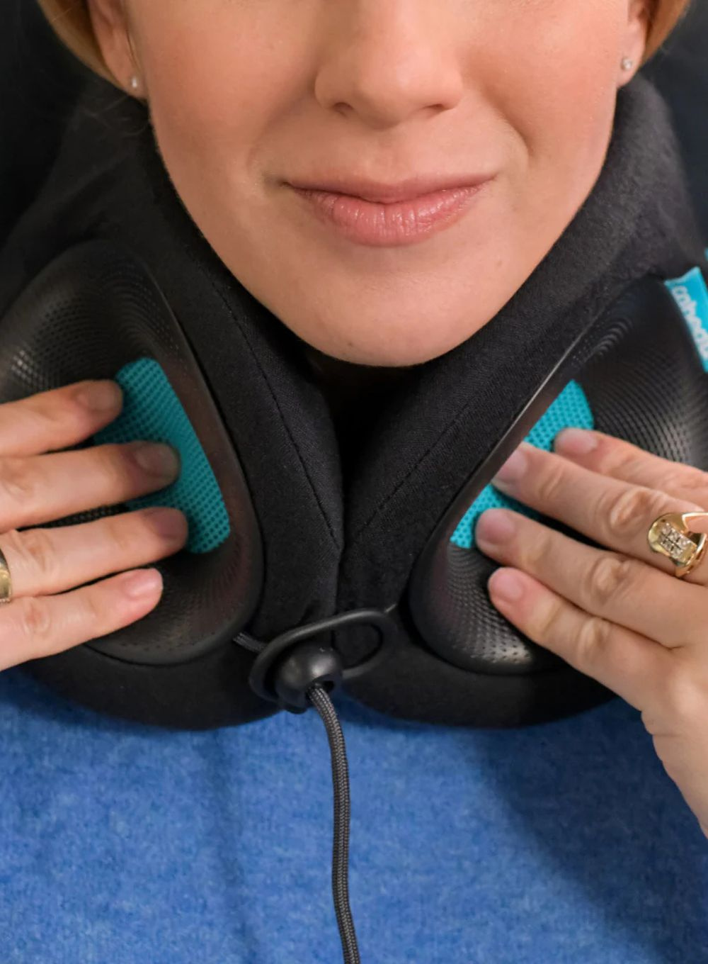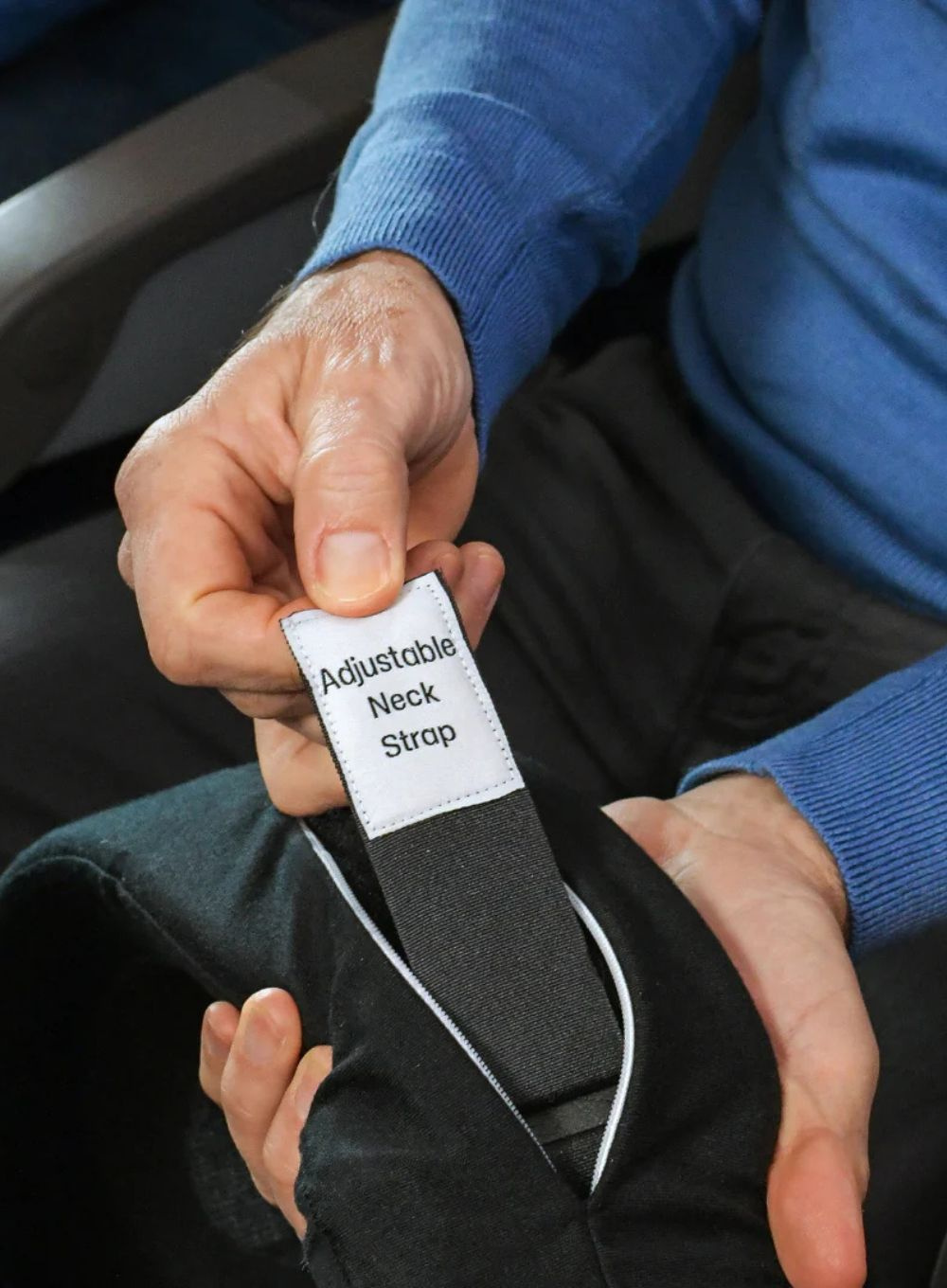• 1). Regulowany pasek na szyję - Z tyłu poduszki, pod zamkiem, znajduje się pasek umożliwiający regulację obwodu. Pociągnij, aby go zmniejszyć, lub poluzuj, aby zwiększyć dopasowanie do szyi.