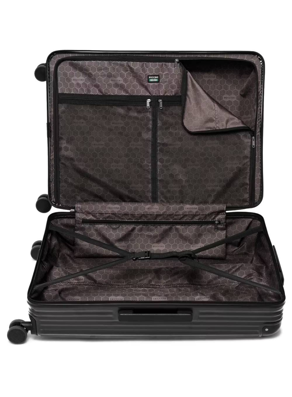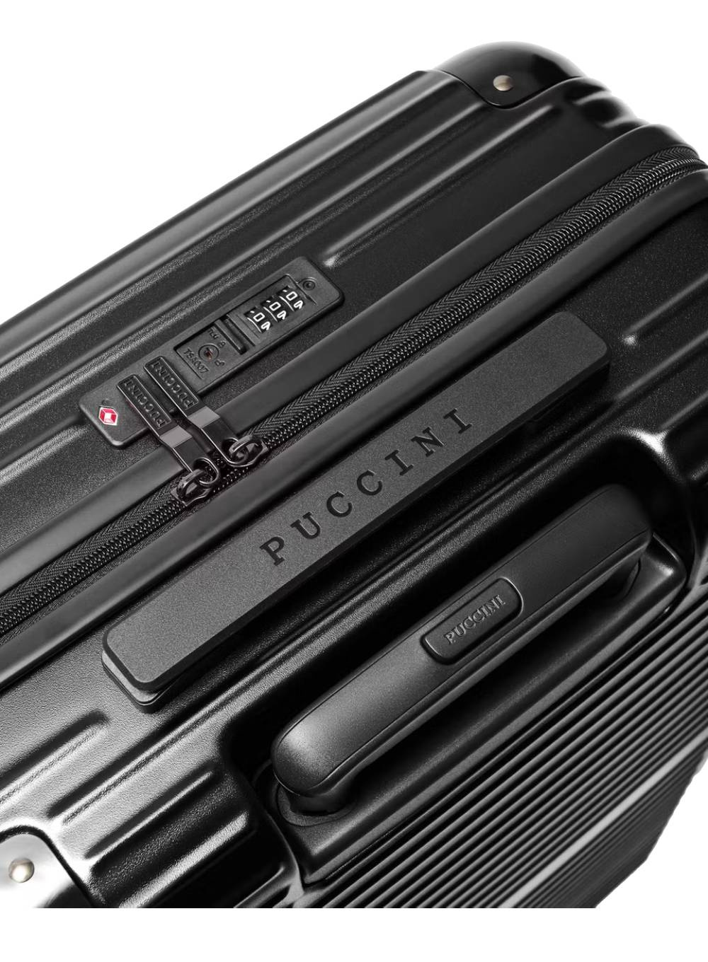 Zamek szyfrowy TSA zapewnia bezpieczeństwo bagażu podczas podróży, szczególnie w przypadku kontroli celnej, a subtelne logo PUCCINI na froncie podkreśla profesjonalny i prestiżowy charakter walizki.