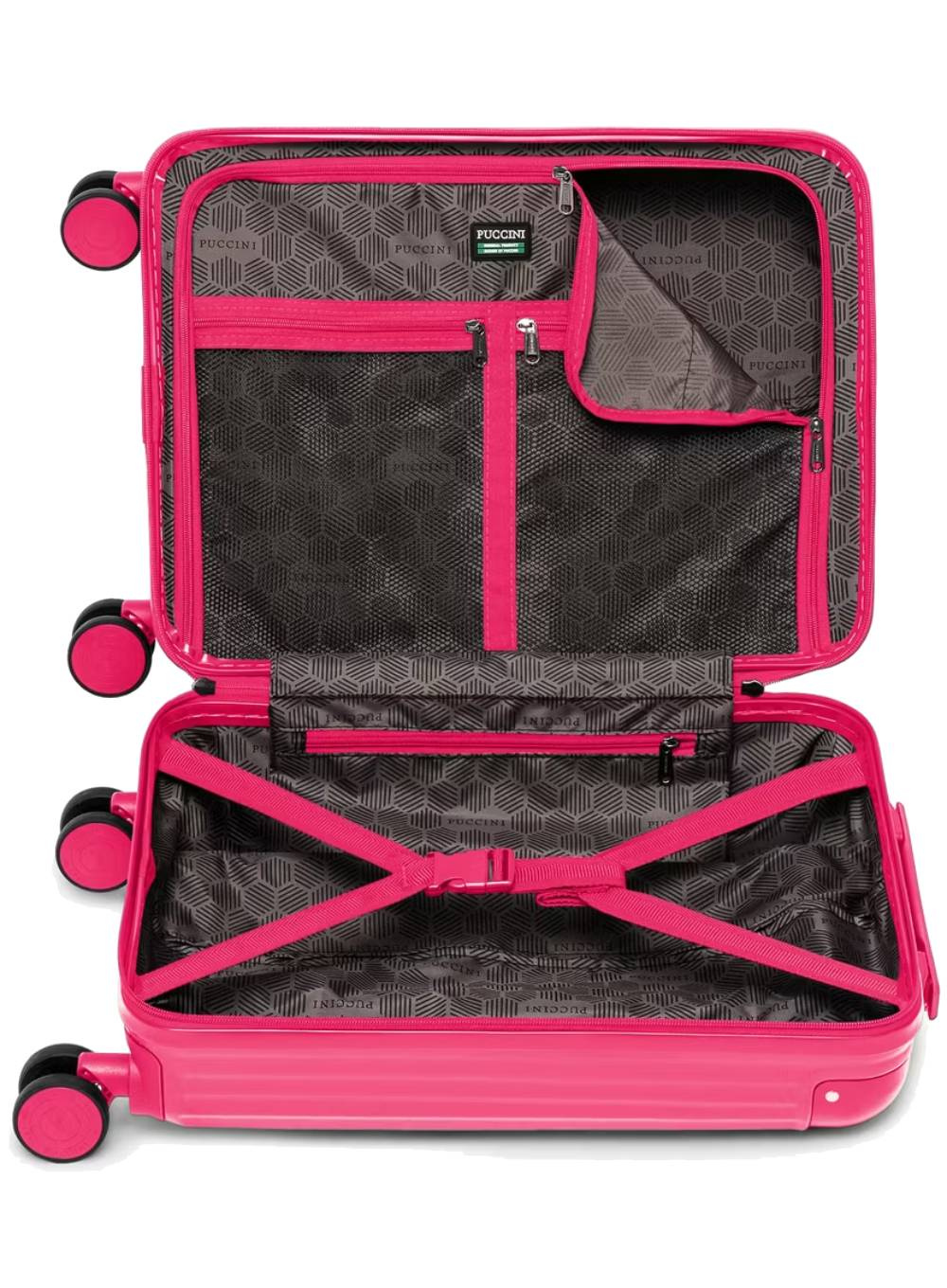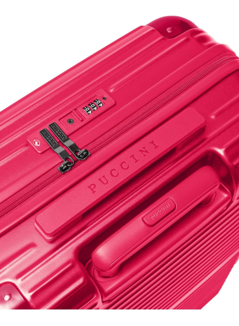 Dla zapewnienia bezpieczeństwa bagażu podczas podróży zastosowano zamek szyfrowy TSA, który umożliwia służbom celnym otwarcie walizki bez jej uszkadzania. Eleganckie logo PUCCINI umieszczone na froncie podkreśla prestiżowy charakter produktu.