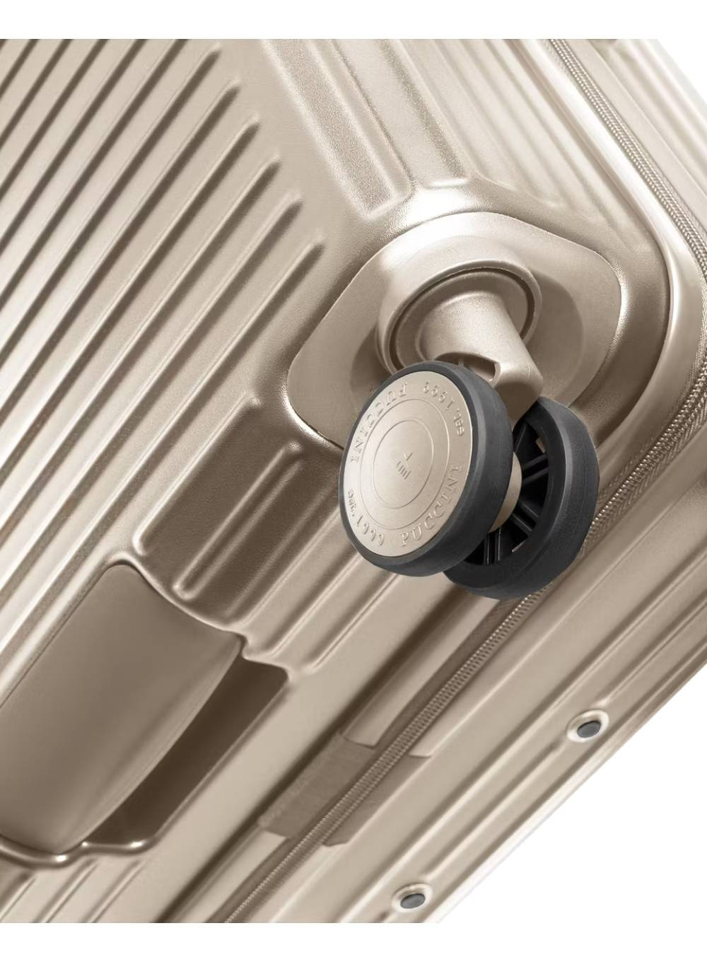 Wytrzymały korpus wykonano z wysokiej jakości poliwęglanu, który skutecznie chroni zawartość przed uszkodzeniami. Aluminiowe narożniki dodatkowo zabezpieczają najbardziej narażone punkty walizki, zwiększając jej odporność na uderzenia. Dzięki dopasowaniu kolorystycznemu stanowią również elegancki akcent stylistyczny.
