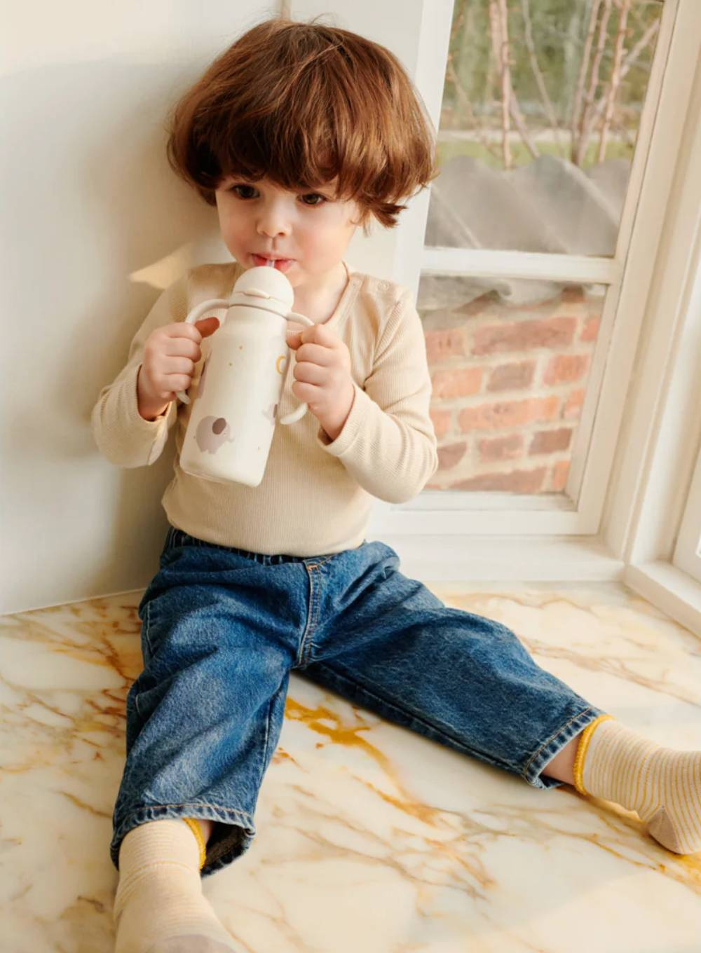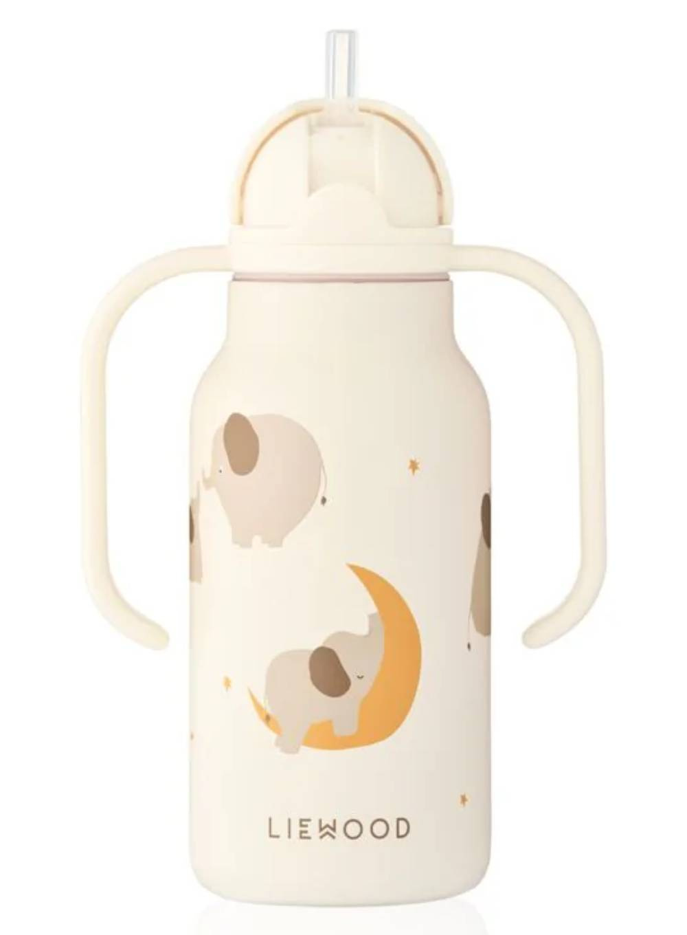 Innowacyjna, przyjazna dla maluchów wersja butelki Falk, butelka na wodę Liewood Kimmie Printed Bottle 250 ml ma dwa łatwe uchwyty na pokrywce, wbudowaną słomkę i jest wykonana ze stali nierdzewnej 18/8.