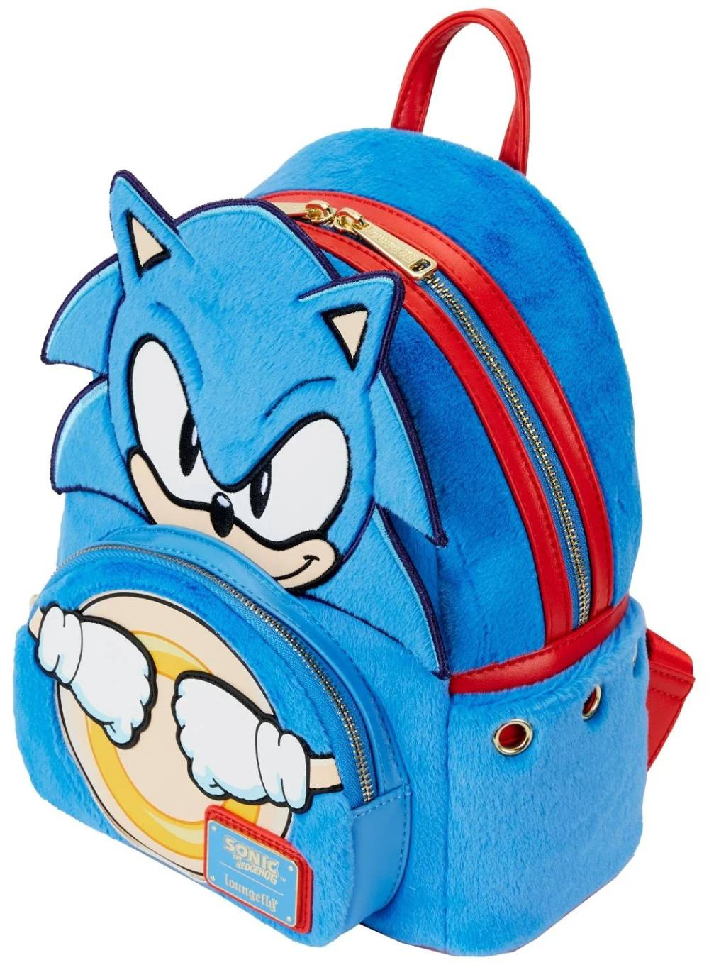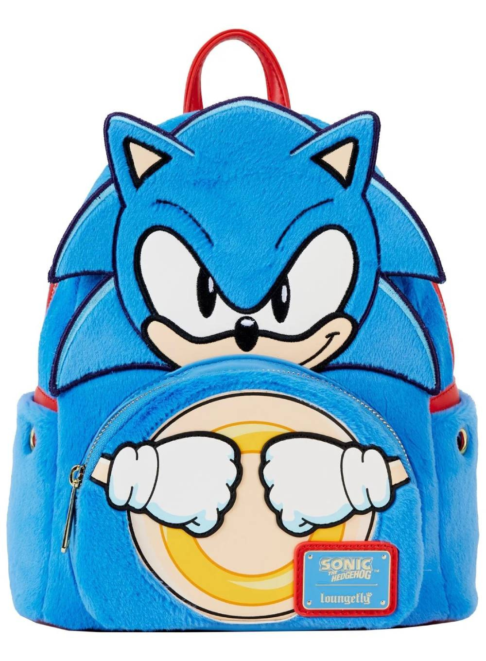 Wyrusz w przygodę z Sonicem dzięki mini plecakowi Loungefly x Sega, inspirowanemu kultowym bohaterem gier wideo. Plecak wykonano z miękkiego, niebieskiego pluszu z elementami z wegańskiej skóry i wykończono aplikacjami, haftami oraz nadrukami, które wiernie oddają wygląd Sonica. Jego twarz w formie aplikacji wystaje ponad górną krawędź plecaka, a na przedniej kieszeni trzyma on złoty pierścień, będący jednocześnie praktyczną kieszenią na suwak.