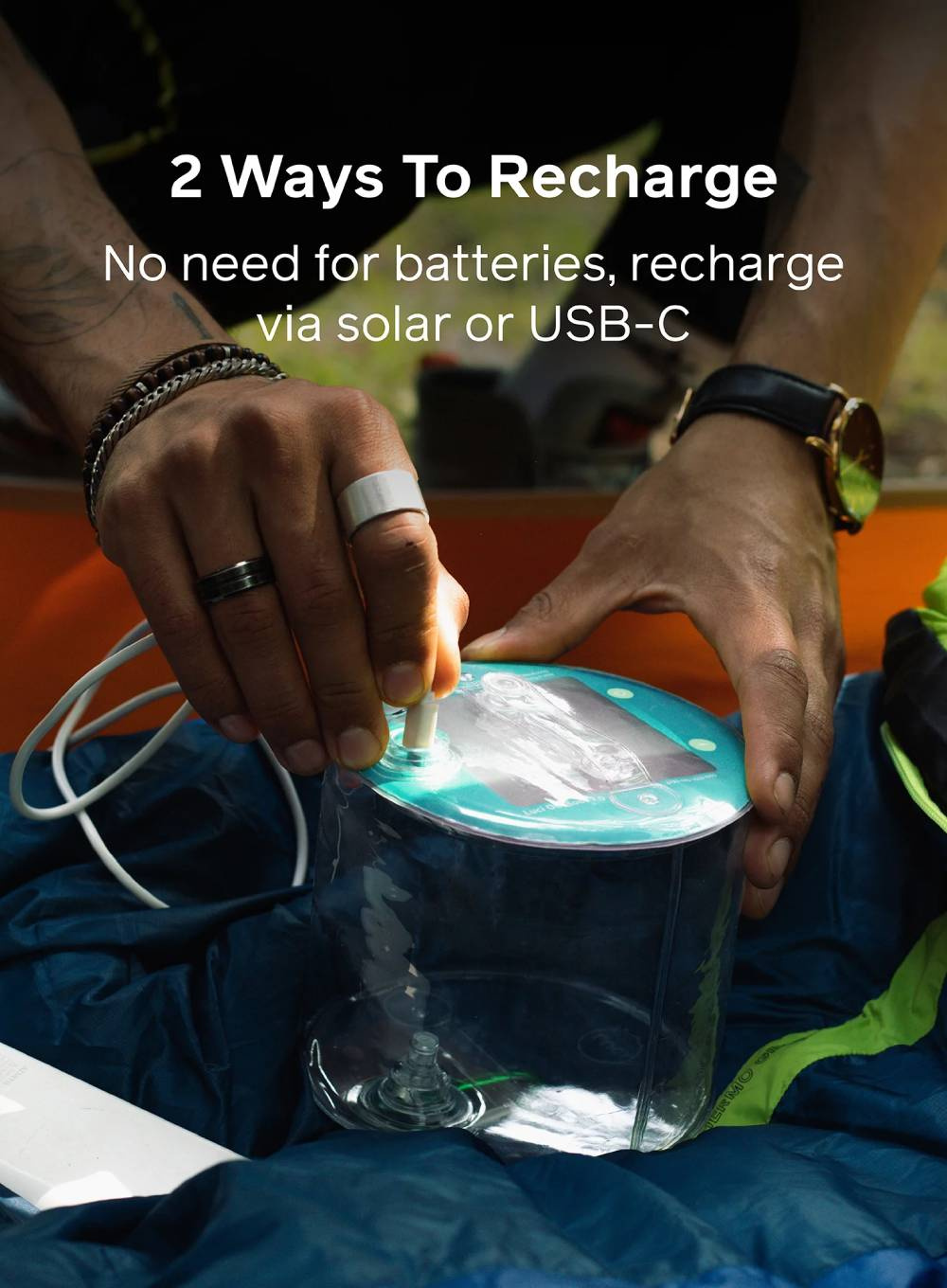 - Ładowanie na dwa sposoby: przez panel solarny (7 godzin) lub USB-C (3 godziny)