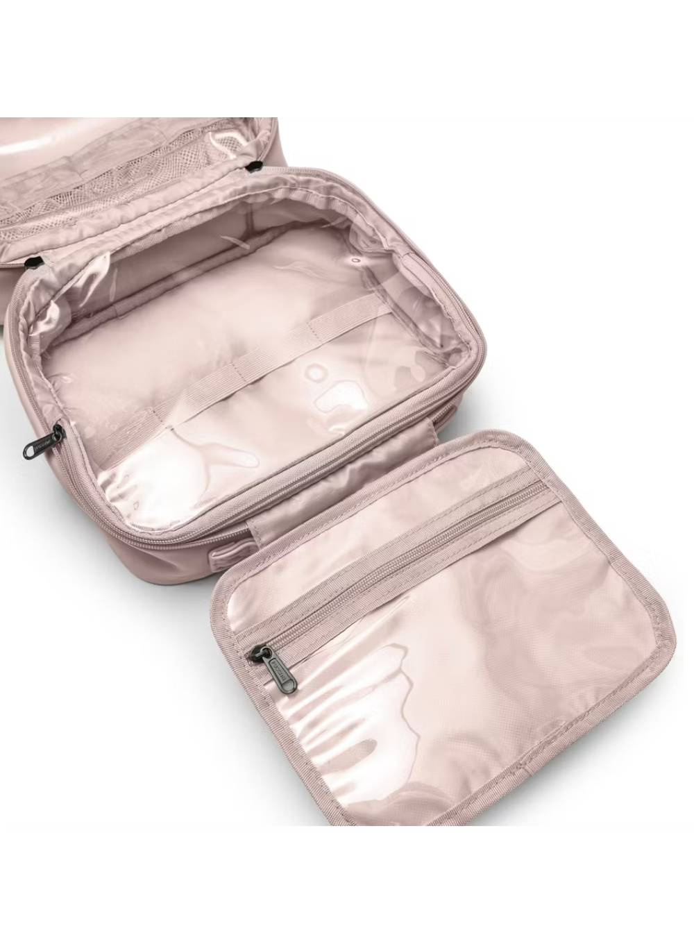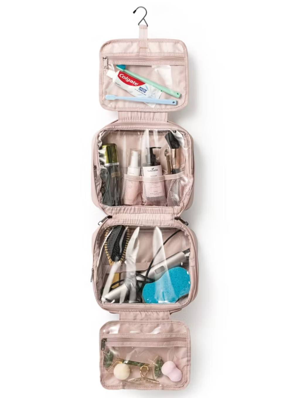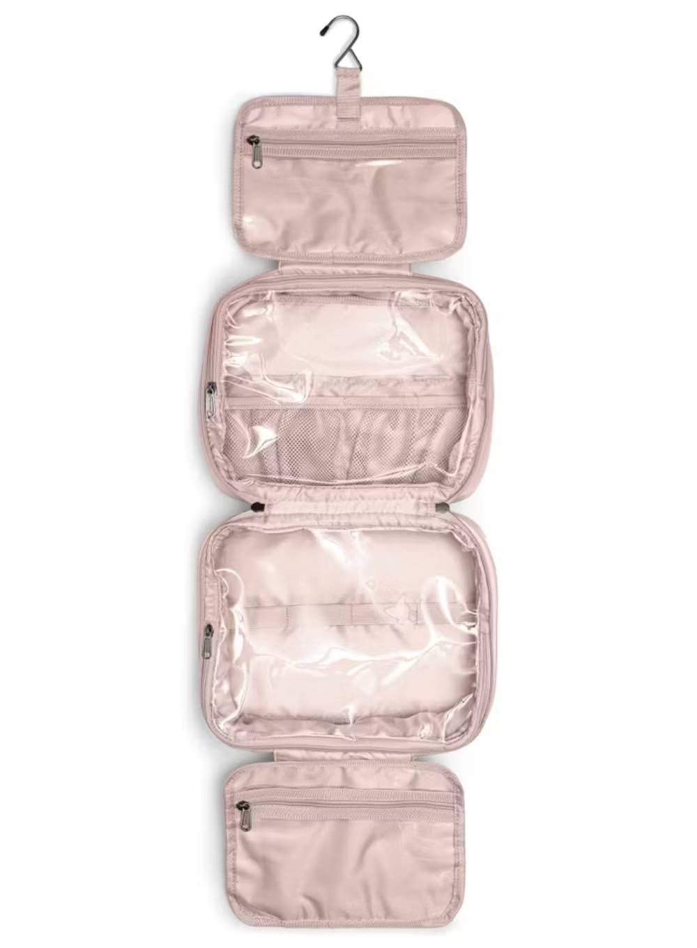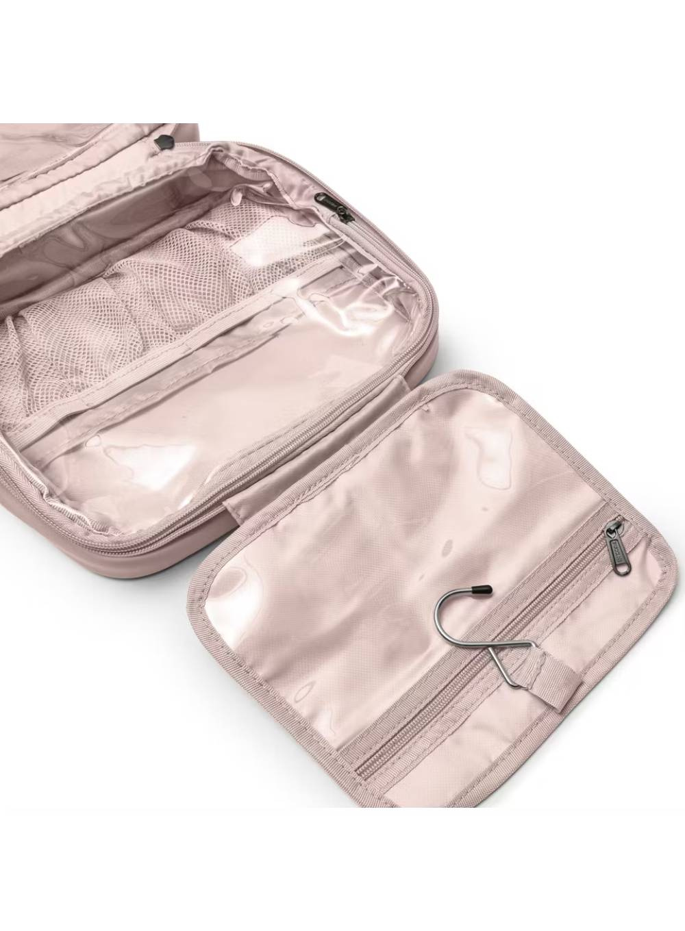 Po otwarciu kosmetyczka rozkłada się na cztery funkcjonalne sekcje. Pierwsza zawiera praktyczny haczyk, dzięki któremu można zawiesić kosmetyczkę w dowolnym miejscu - na przykład w hotelowej łazience - oraz małą kieszonkę na drobne akcesoria. Druga część to kieszeń z przegrodami, umożliwiająca bezpieczne przechowywanie kosmetyków w pozycji pionowej. Trzecia sekcja to większa kieszeń, idealna na większe przedmioty, takie jak szczotka do włosów czy balsam do ciała. Czwarta kieszonka pomieści mniejsze przedmioty, które warto mieć pod ręką.