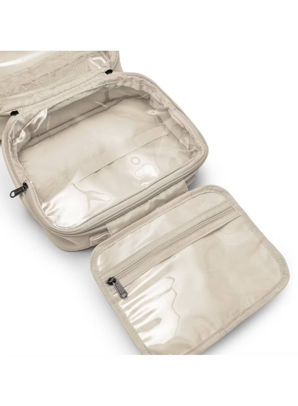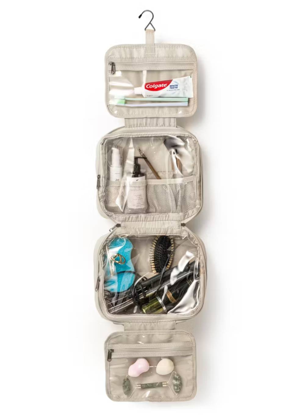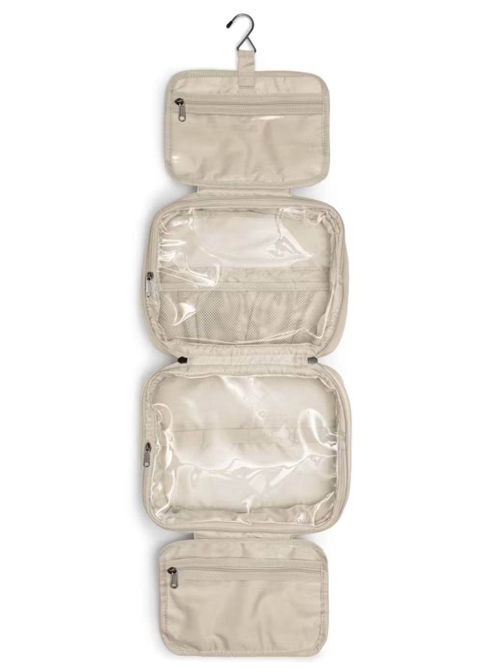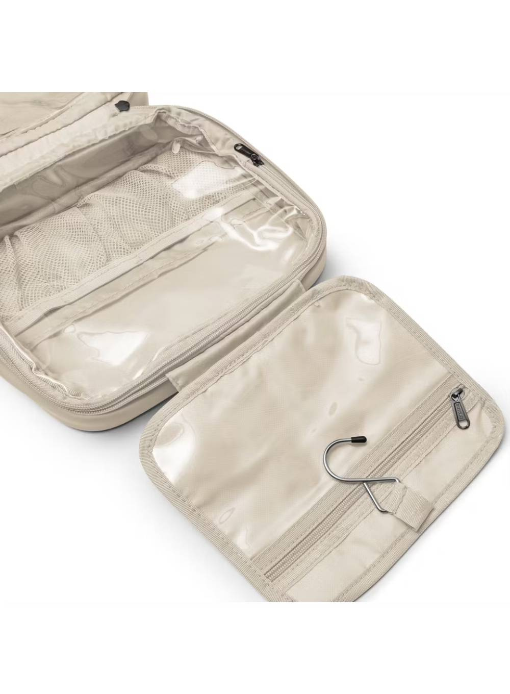 Po otwarciu kosmetyczka rozkłada się na cztery funkcjonalne sekcje. Pierwsza zawiera praktyczny haczyk, dzięki któremu można zawiesić kosmetyczkę w dowolnym miejscu - na przykład w hotelowej łazience - oraz małą kieszonkę na drobne akcesoria. Druga część to kieszeń z przegrodami, umożliwiająca bezpieczne przechowywanie kosmetyków w pozycji pionowej. Trzecia sekcja to większa kieszeń, idealna na większe przedmioty, takie jak szczotka do włosów czy balsam do ciała. Czwarta kieszonka pomieści mniejsze przedmioty, które warto mieć pod ręką.