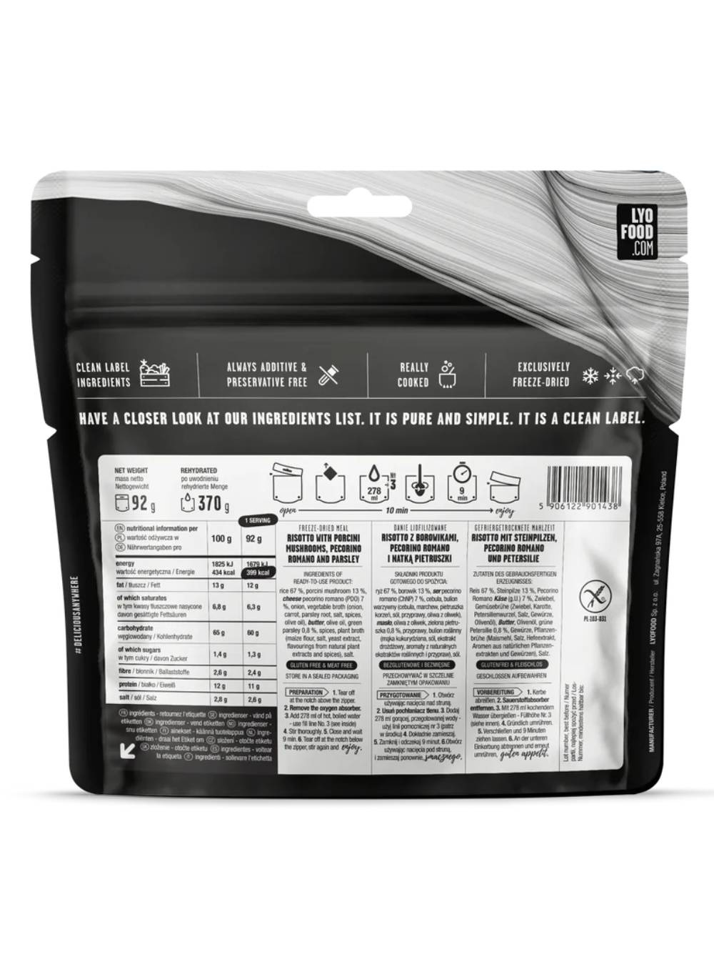 Posiłki LYOFOOD są produkowane wyłącznie w Polsce. Lekkie opakowanie sprawia, że posiłek bez problemu zmieścisz w plecaku czy torbie oraz umożliwia swobodne przygotowanie dania bezpośrednio w opakowaniu.