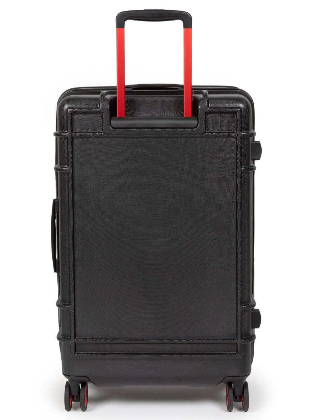 Walizka wyposażona jest w ciche, japońskie kółka 360° gwarantujące płynne manewrowanie, teleskopowy uchwyt z aluminiowymi prowadnicami w czerwonym kolorze oraz uchwyty boczne i górne ułatwiające przenoszenie.