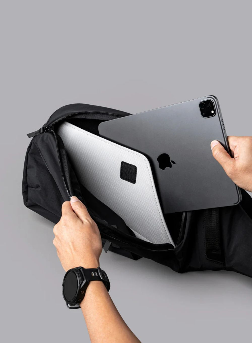 Torba mieści tablet lub laptop do 11 cali w miękko wyściełanej, zabezpieczonej kieszeni z elastycznym paskiem na rzep. Dzięki temu urządzenie pozostaje na swoim miejscu nawet podczas szybkiego otwierania w biegu.