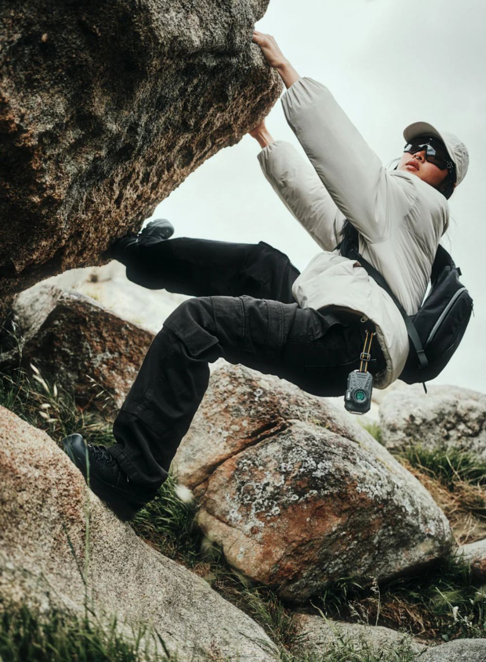 - Łatwo dostępna kieszeń na pasku na telefon z zamknięciem na zamek błyskawiczny