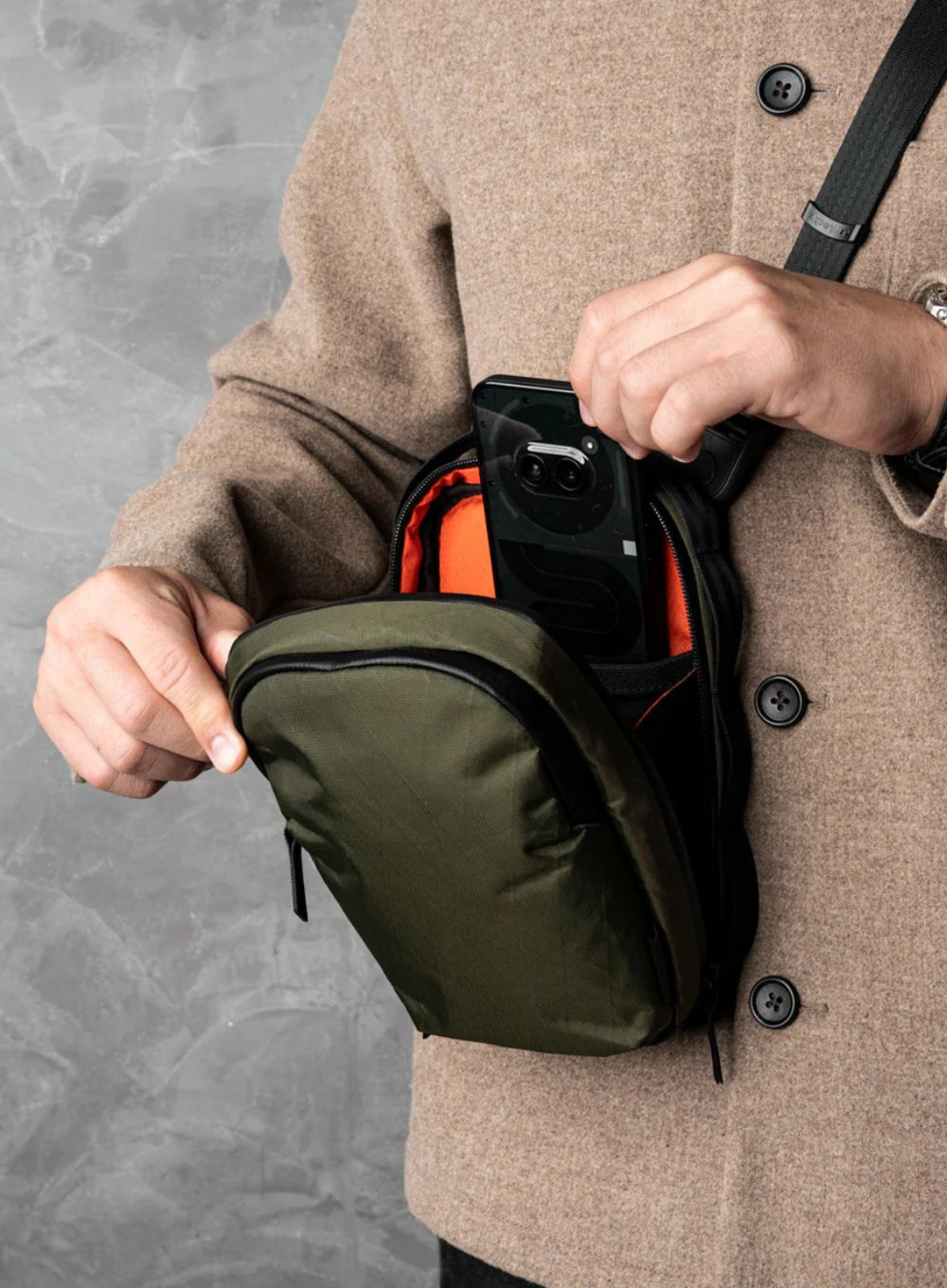 Portretowa orientacja torby sprawia, że idealnie przylega do ciała, a płaski profil gwarantuje wygodę podczas noszenia. Dwa osobne segmenty - główna komora i szybki dostęp z przodu - umożliwiają rozdzielenie najważniejszych przedmiotów od pozostałych rzeczy.
