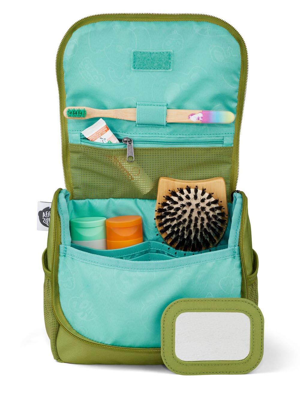 Wyjątkowym elementem kosmetyczki jest wysuwany język z miejscem na imię dziecka oraz odpinane lusterko mocowane na rzep, które sprawia, że mycie zębów czy czesanie się staje się jeszcze łatwiejsze. Dzięki hydrofobowemu i odpornemu na zabrudzenia materiałowi wykonanemu w 48% z przetworzonych butelek PET, kosmetyczka Affenzahn to ekologiczny i trwały wybór.