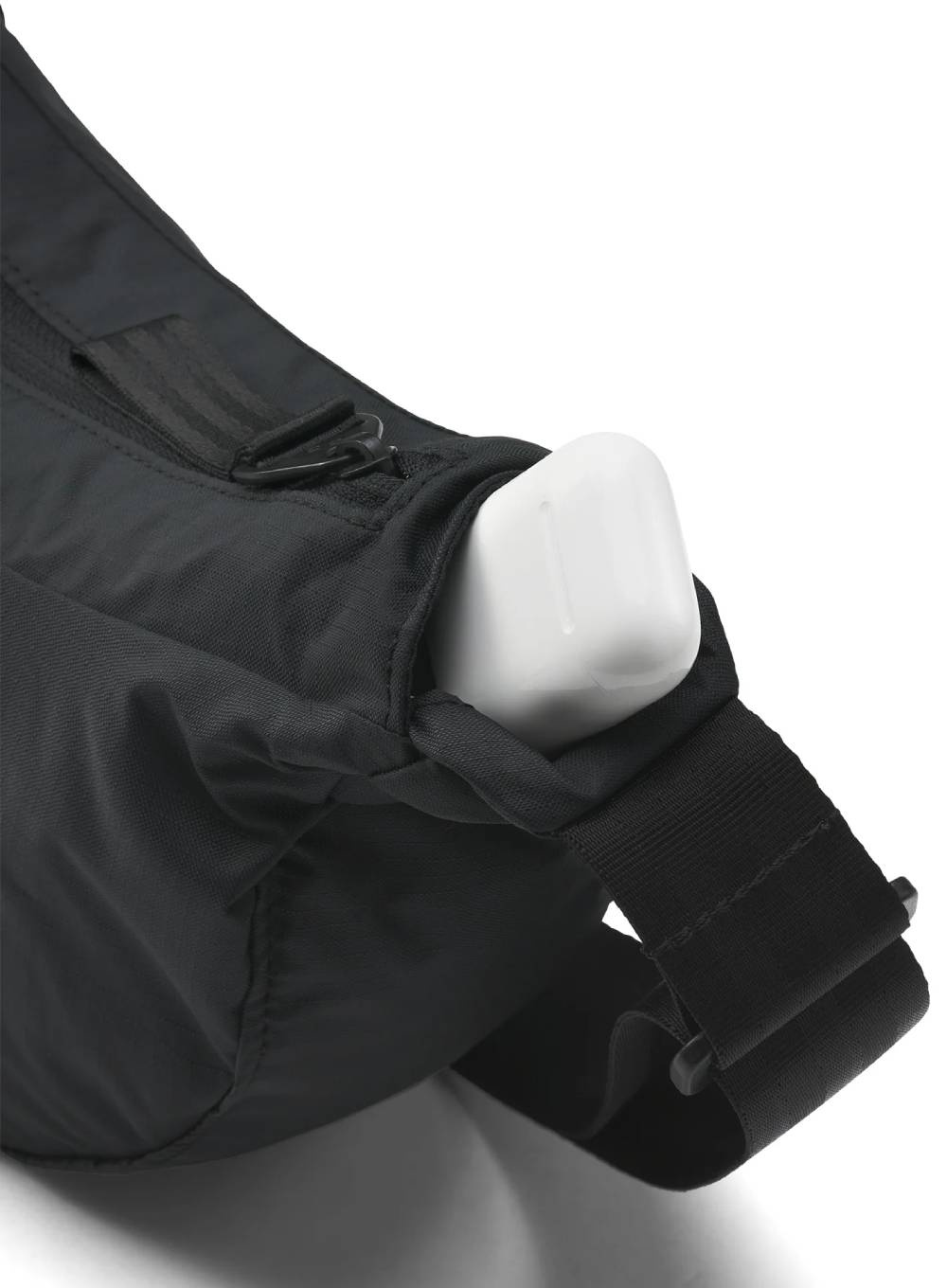 Wewnątrz znajduje się również ukryta kieszeń na słuchawki AirPods, zapewniająca szybki i bezpieczny dostęp. Torba wykonana jest z wytrzymałego materiału (nylonu ripstop) pochodzącego w 100% z recyklingu, a podszewka powstała z przetworzonych butelek PET.