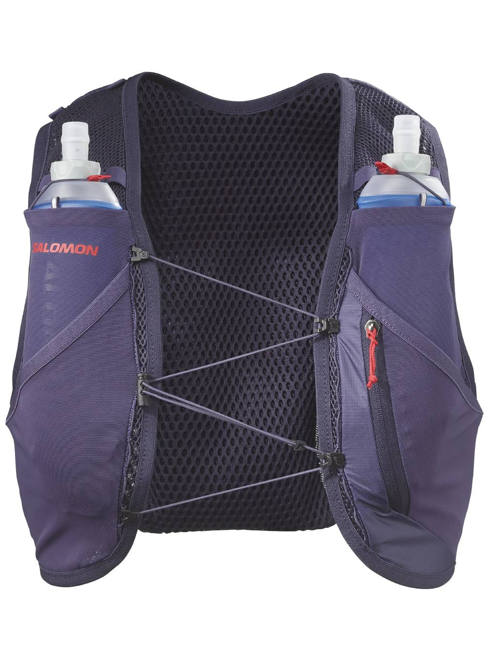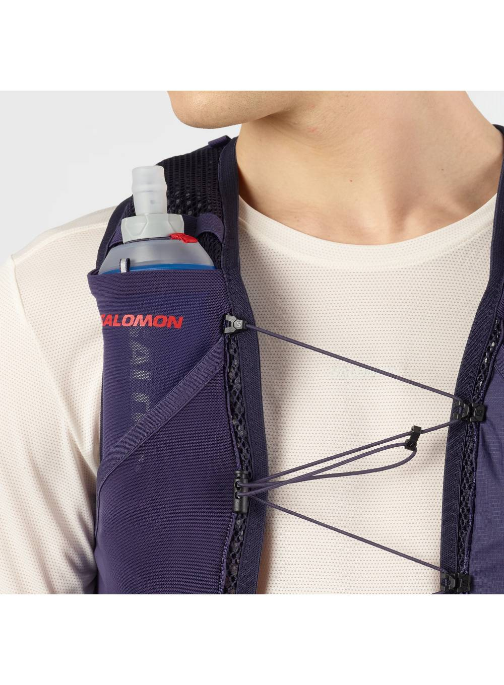 Salomon Active Skin 4 GRVL to lekka i wygodna kamizelka biegowa unisex z dwoma miękkimi bidonami 500 ml. Idealna na krótsze wyprawy w teren, zapewnia łatwy dostęp do wody, bezpieczne przechowywanie i precyzyjne dopasowanie dzięki technologii SensiFit™.